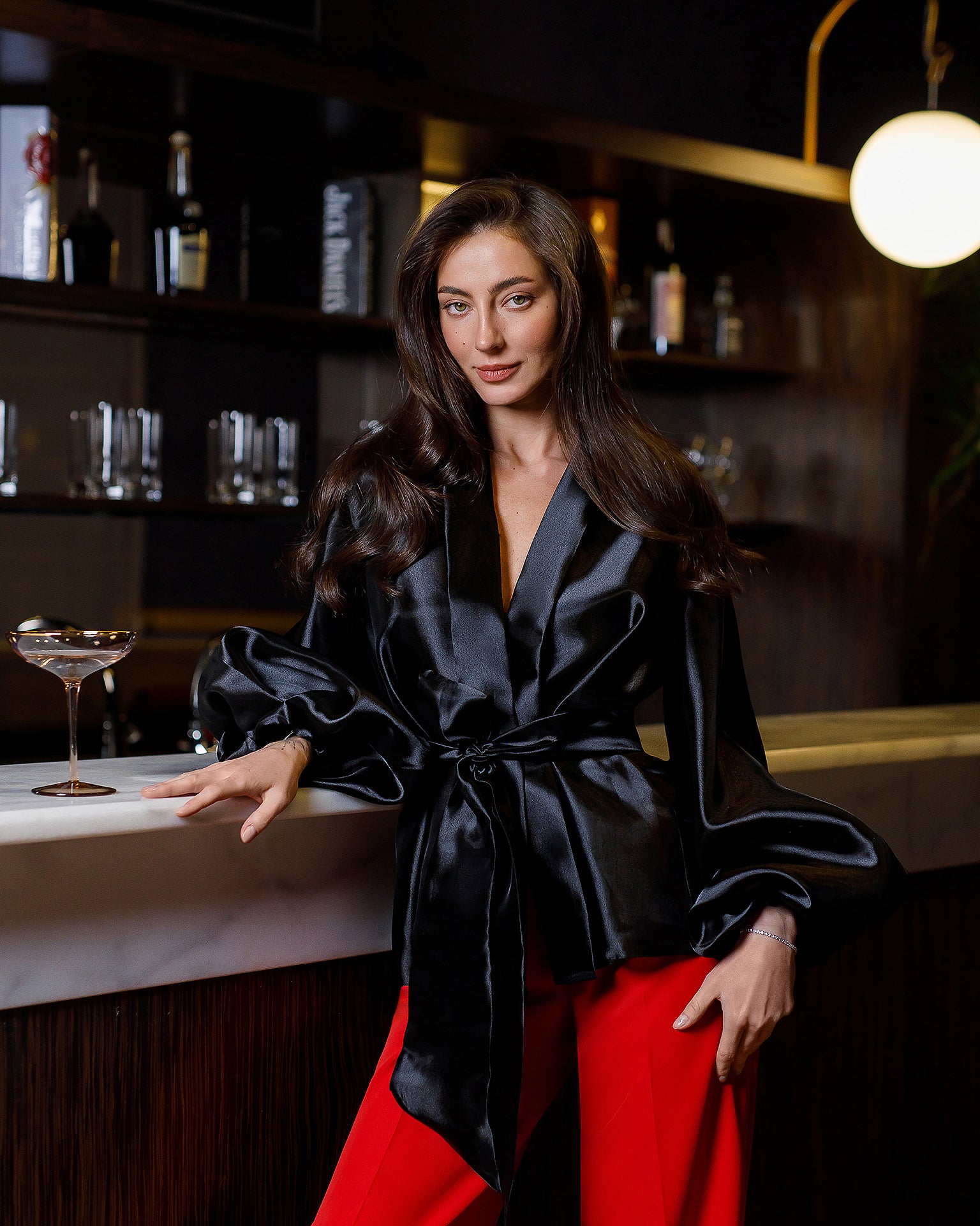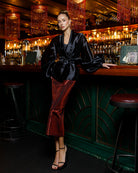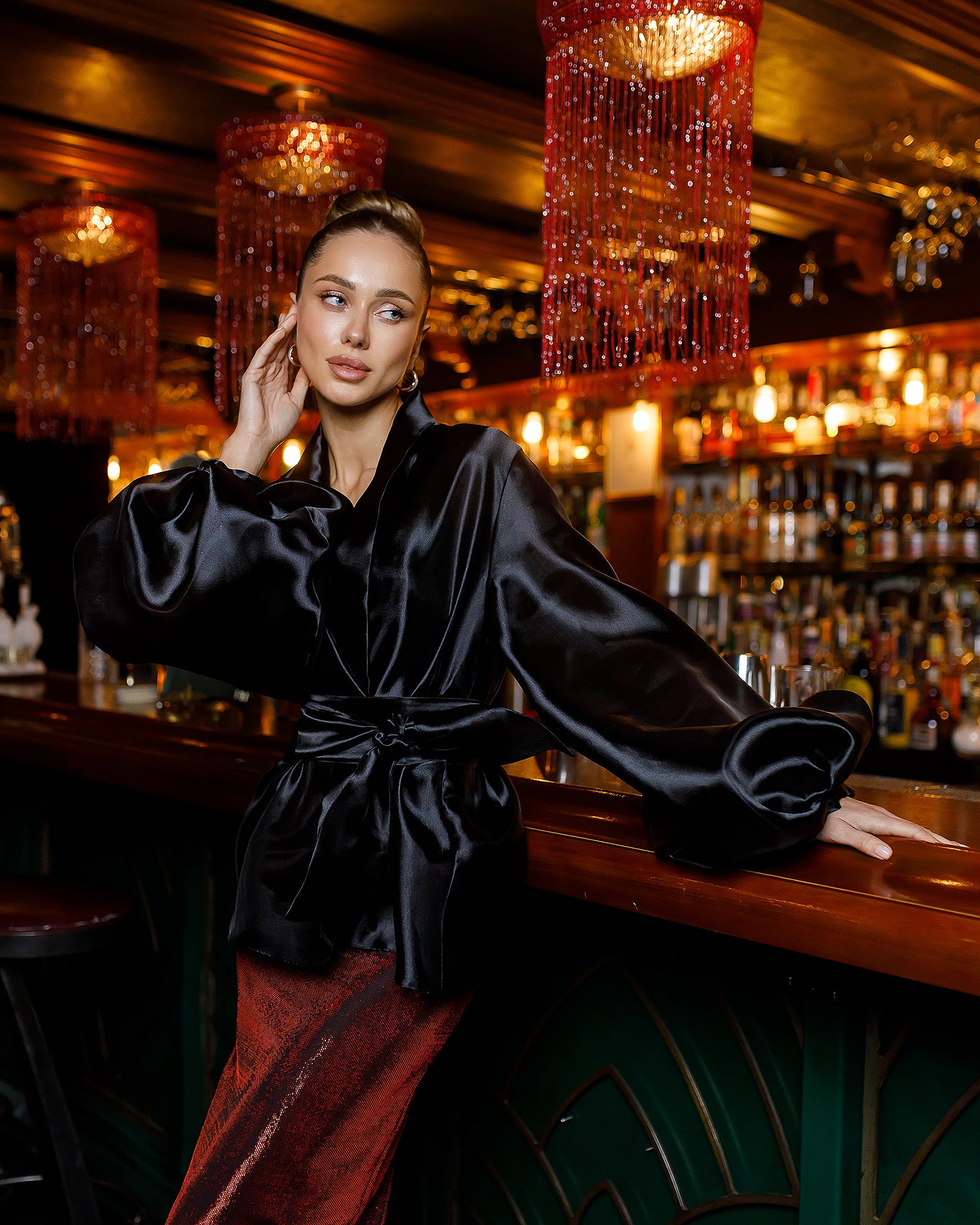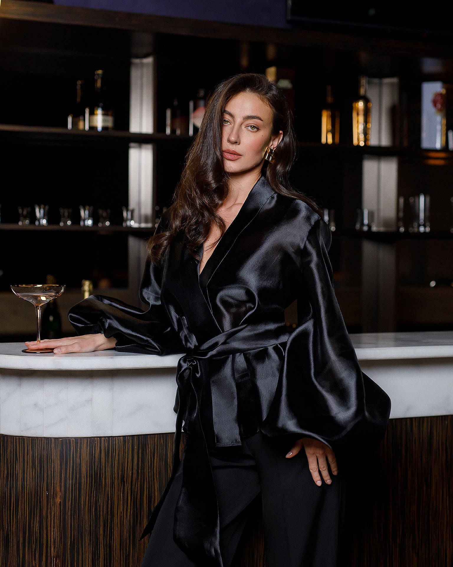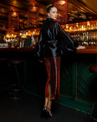 Black Shawl Collar Puff-Sleeve Belted Tunic Blouse