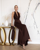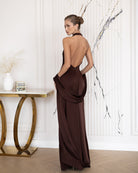 Céline Brown Satin Drape Halter-Neck Backless Maxi Dress