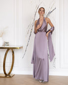 Céline Mocco Satin Drape Halter-Neck Backless Maxi Dress