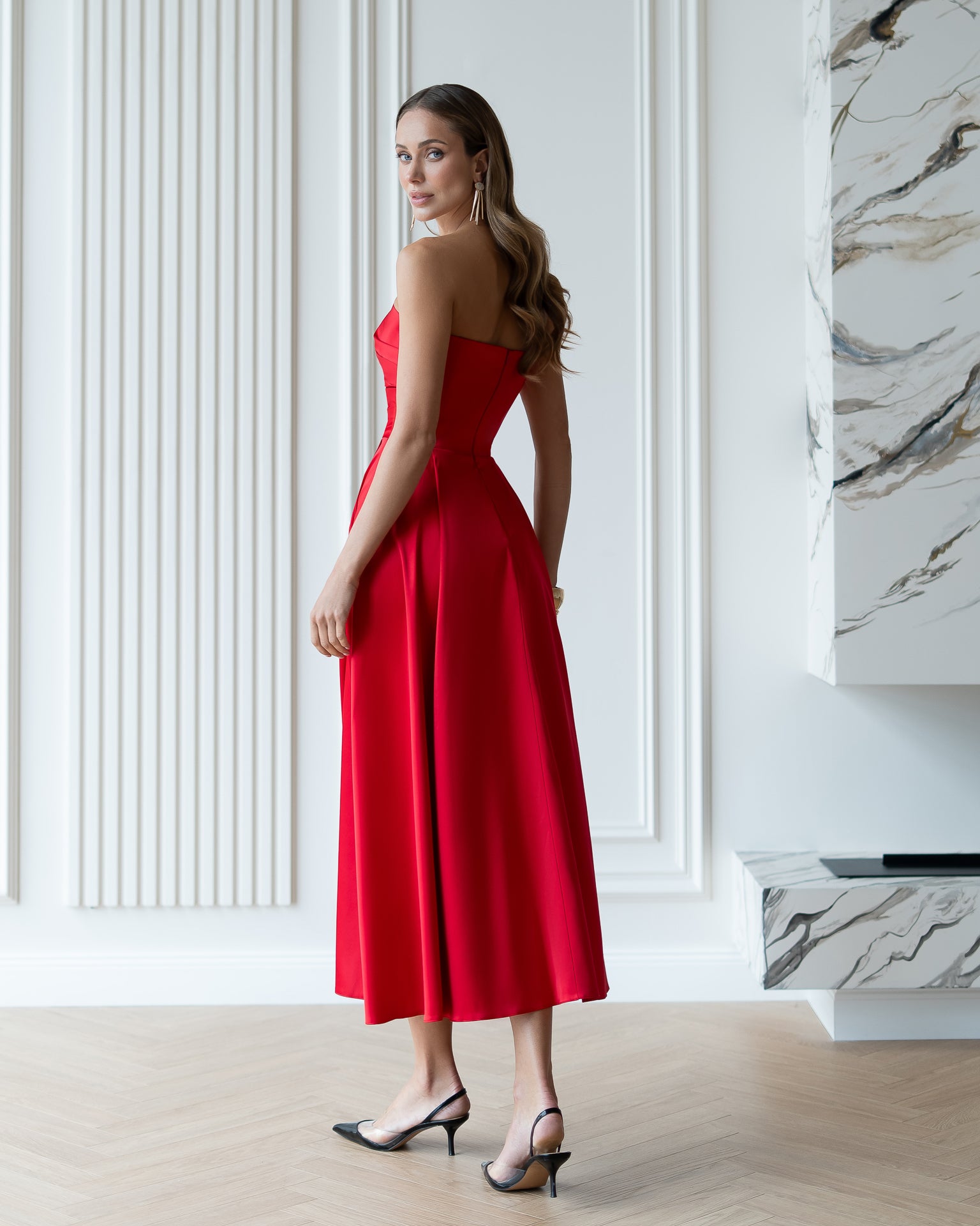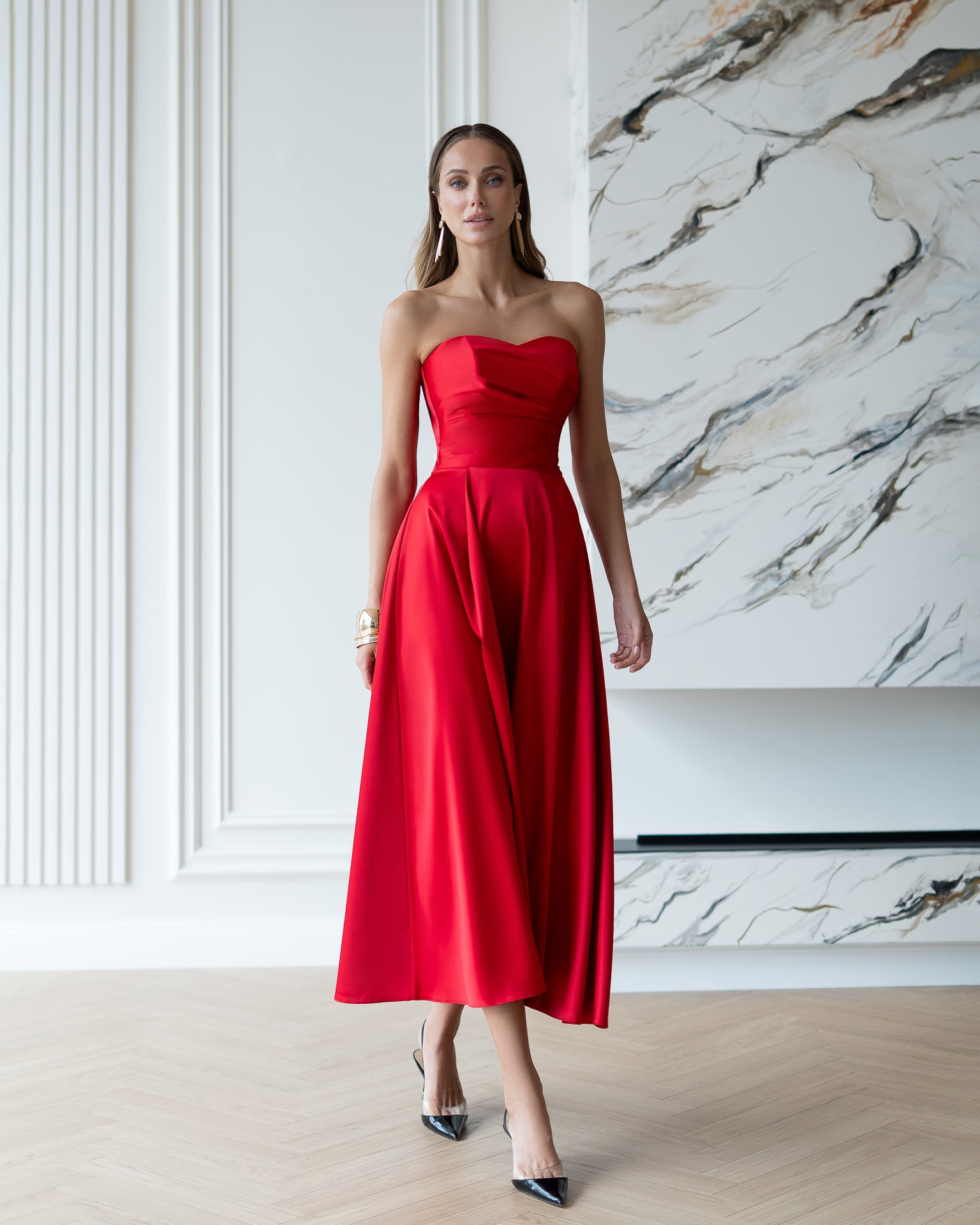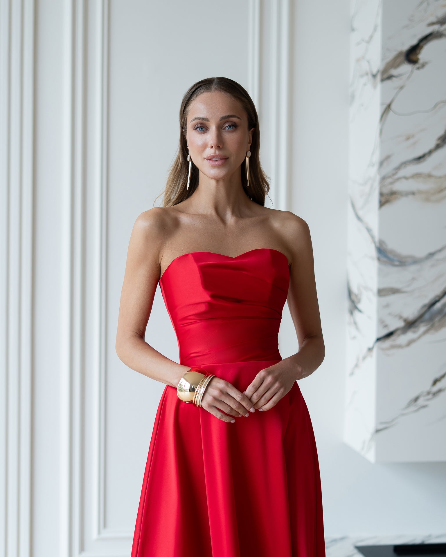 Nova Red Satin Strapless Sweetheart Midi Dress