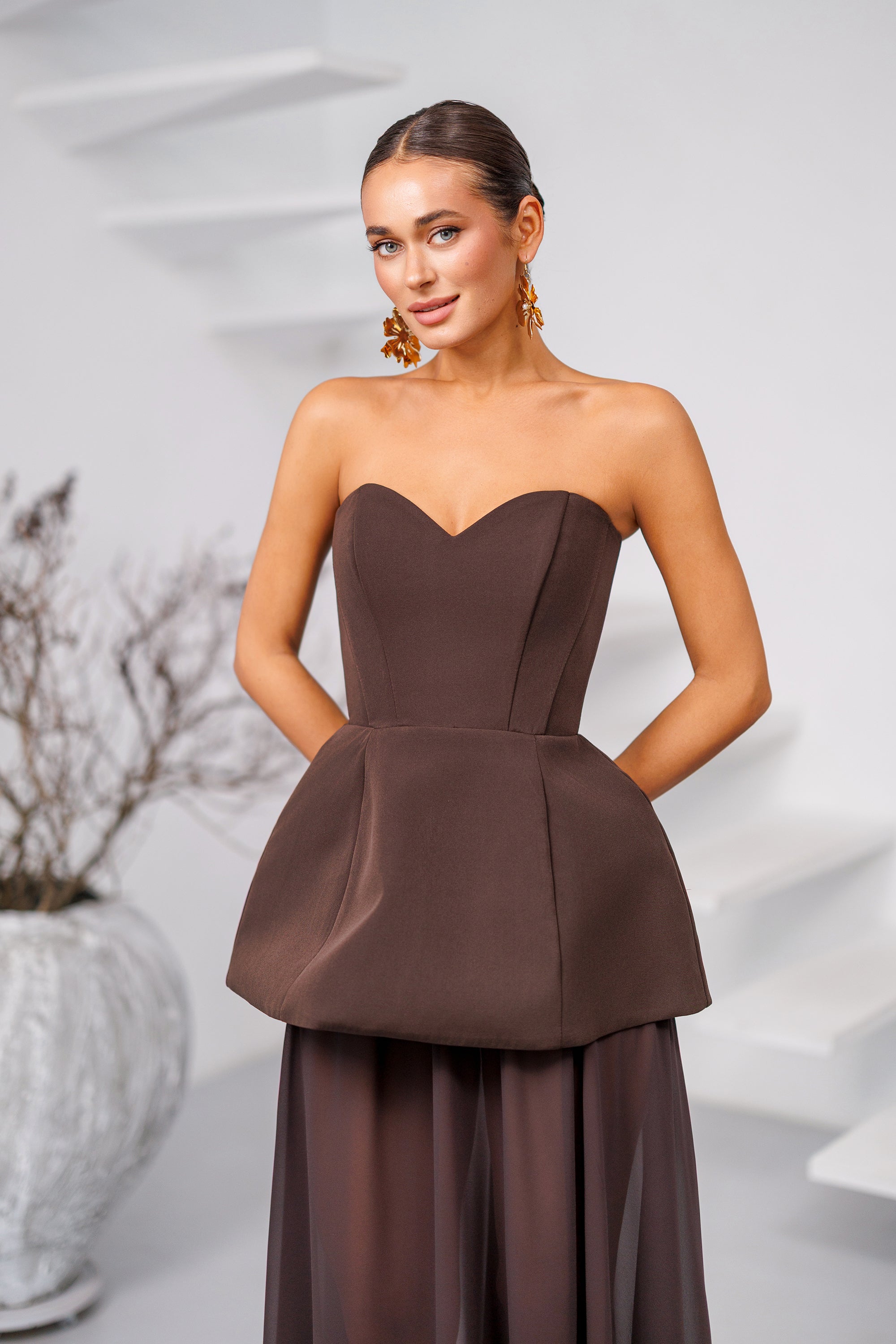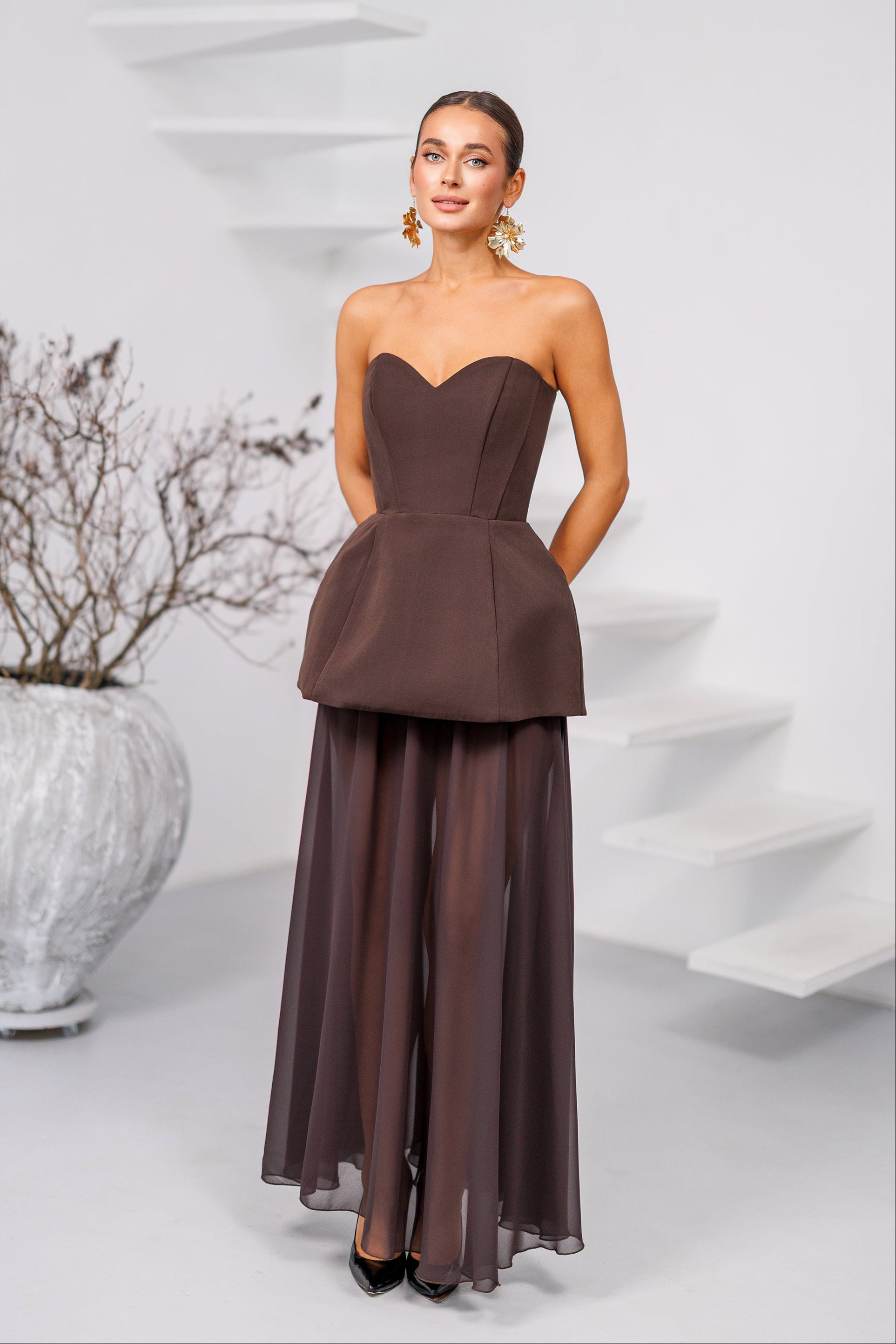 Brown Strapless Sweetheart Chiffon Skirt Maxi Dress