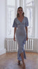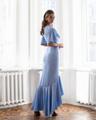 Selina Sky-Blue Satin V-Neck Asymmetric Ruffle Midi Dress