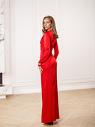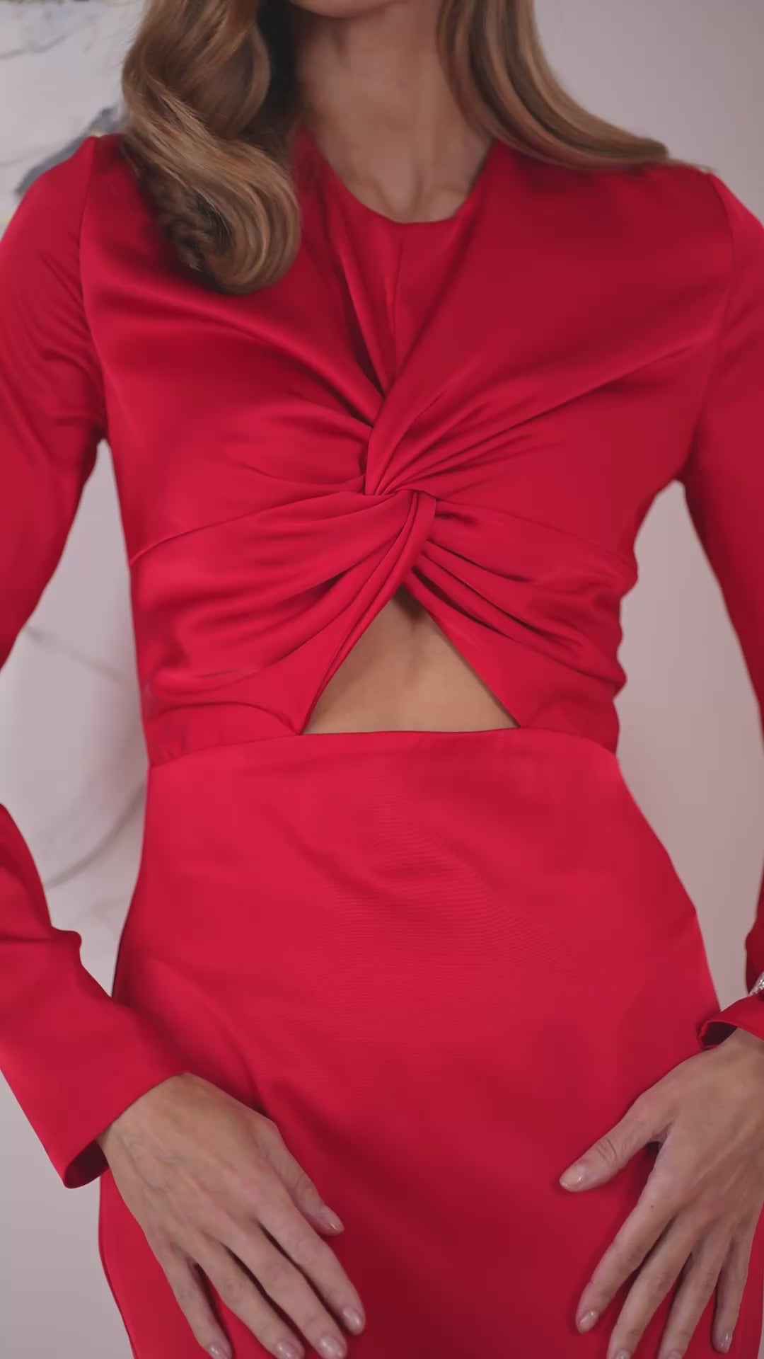 Elara Red Satin Long-Sleeve Cut-Out Maxi Dress