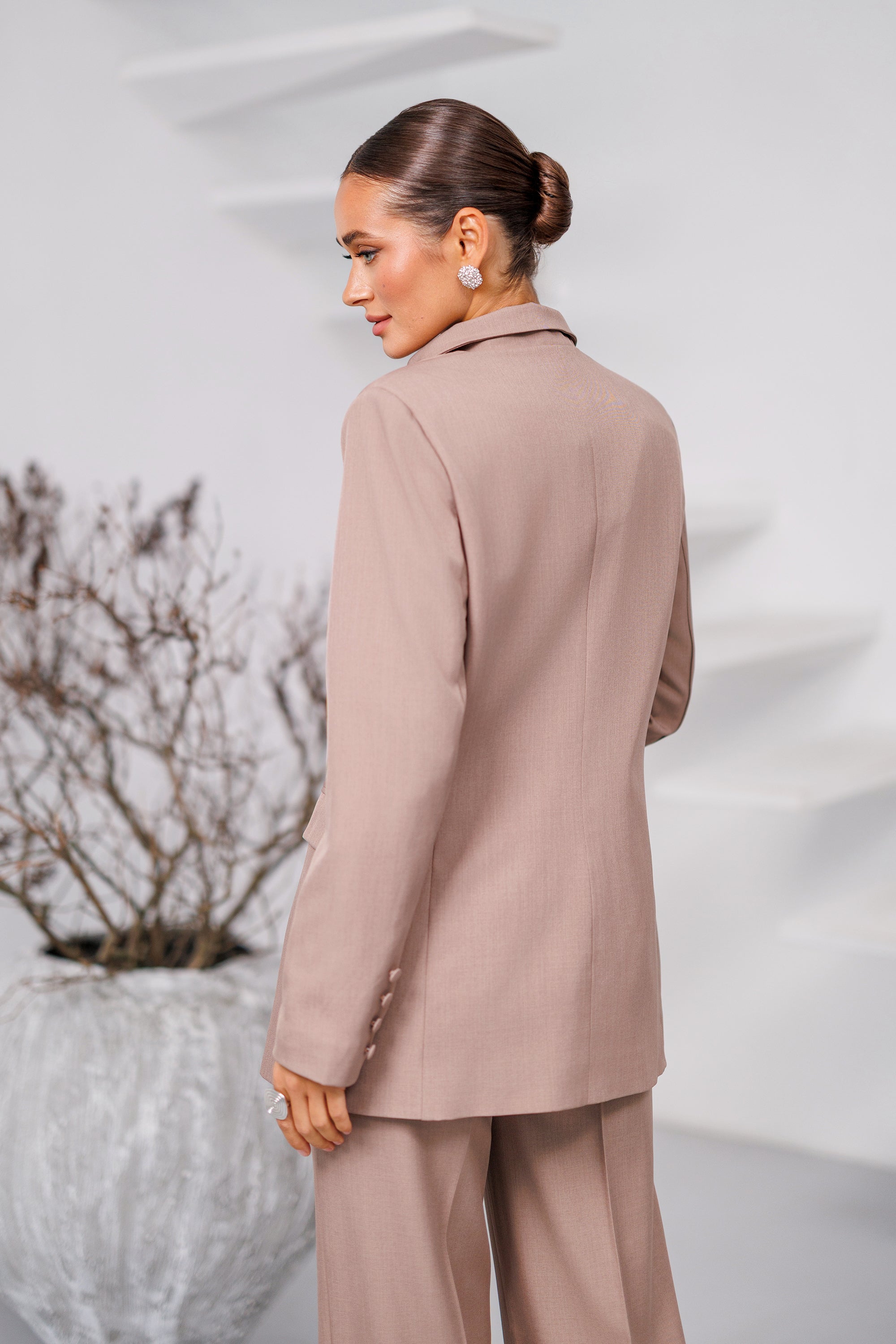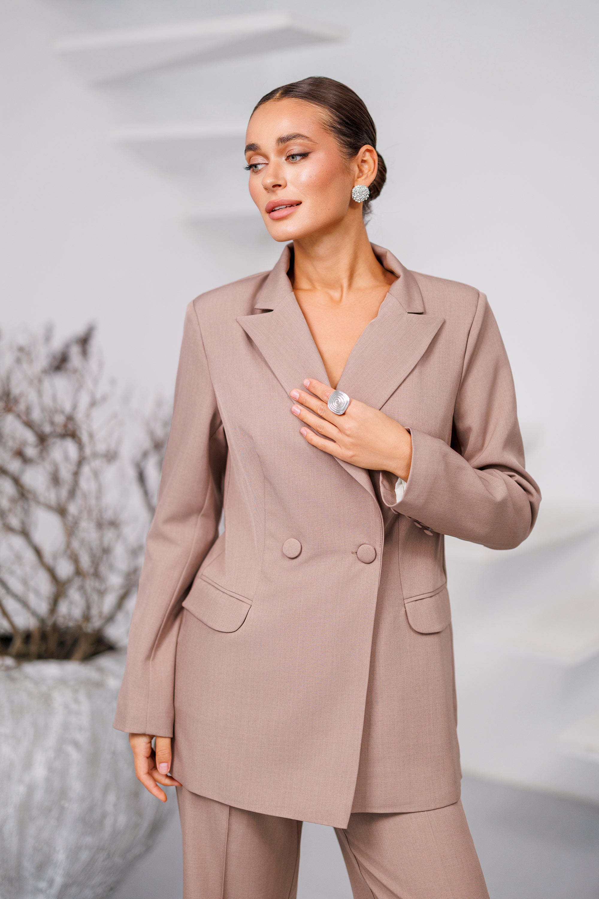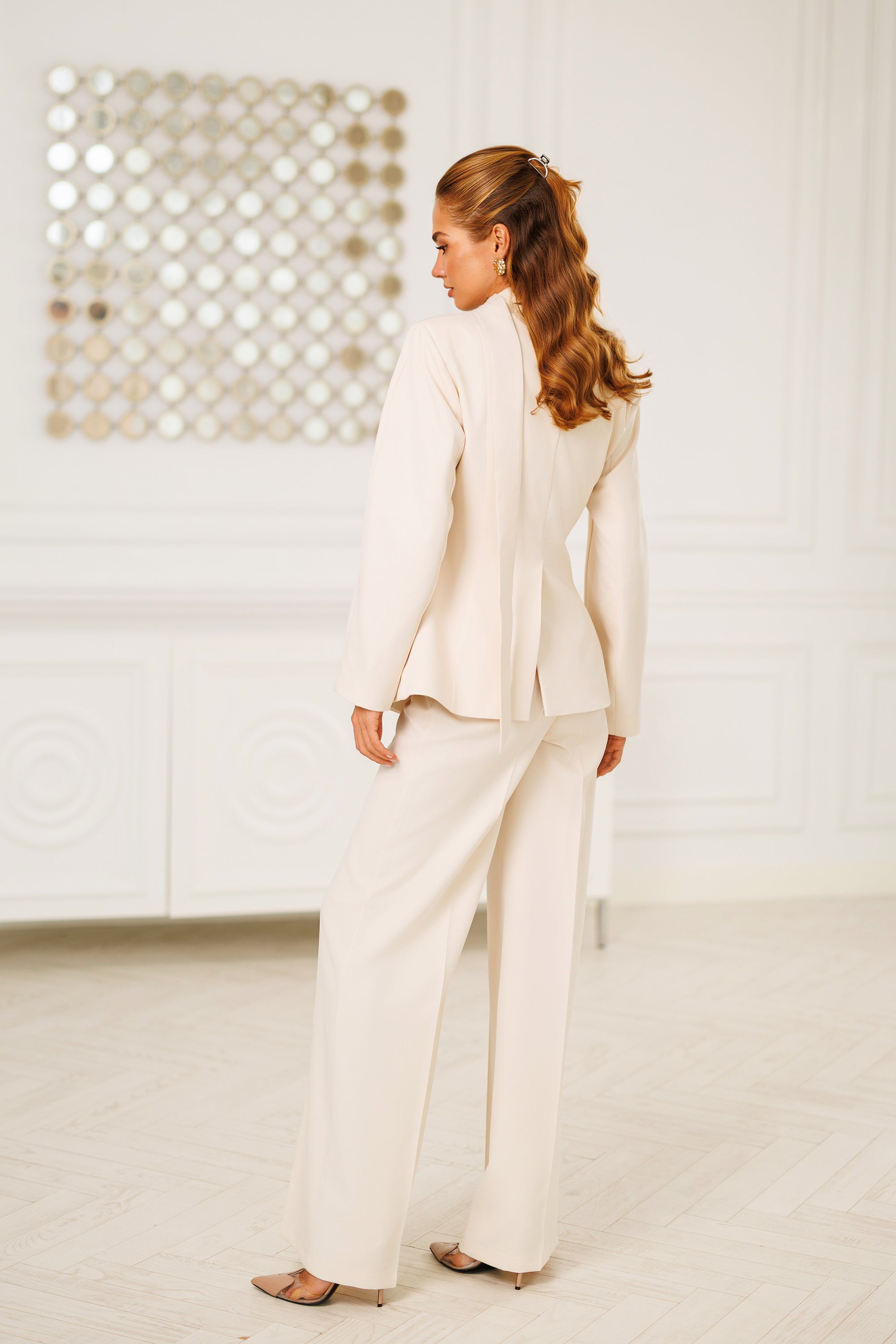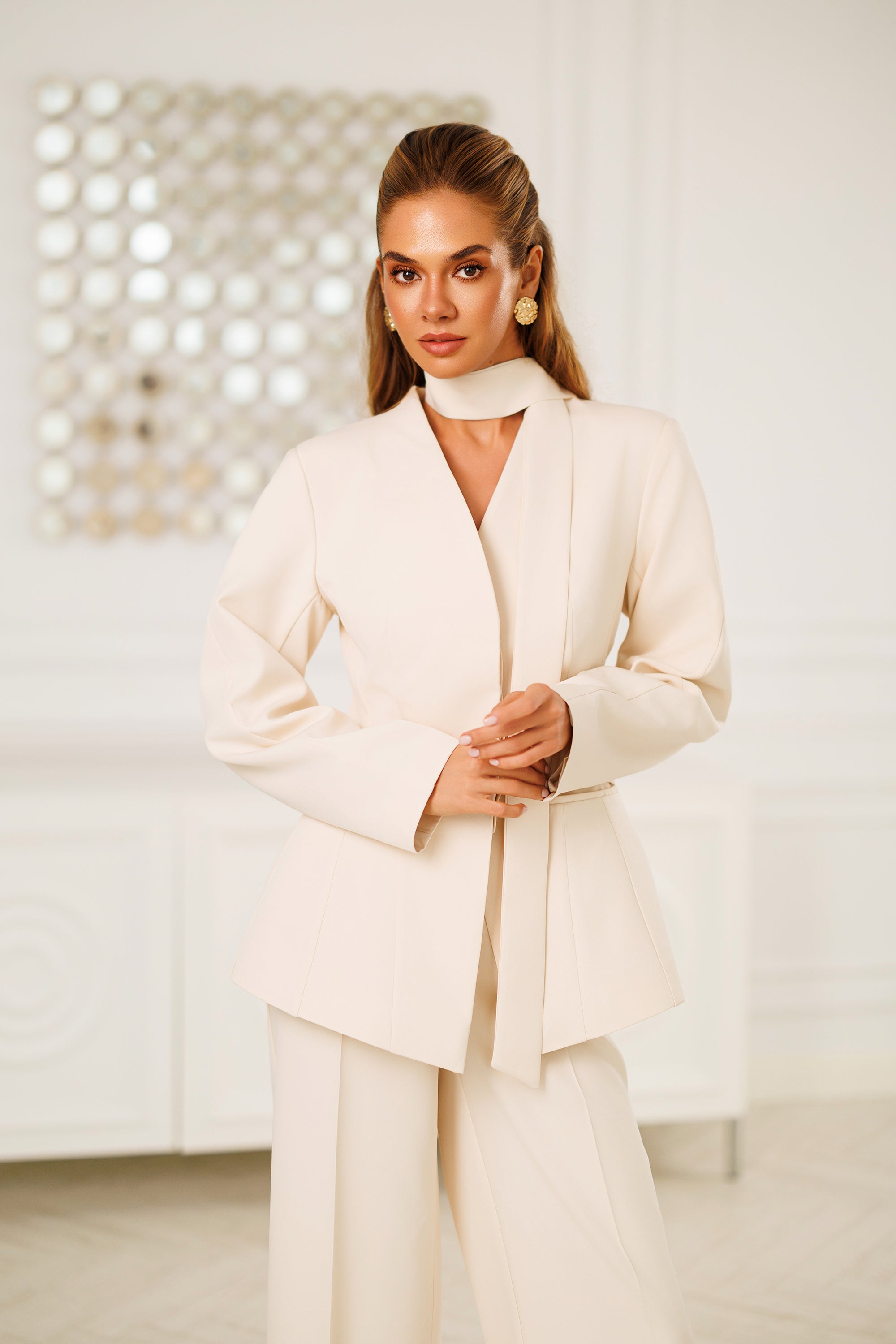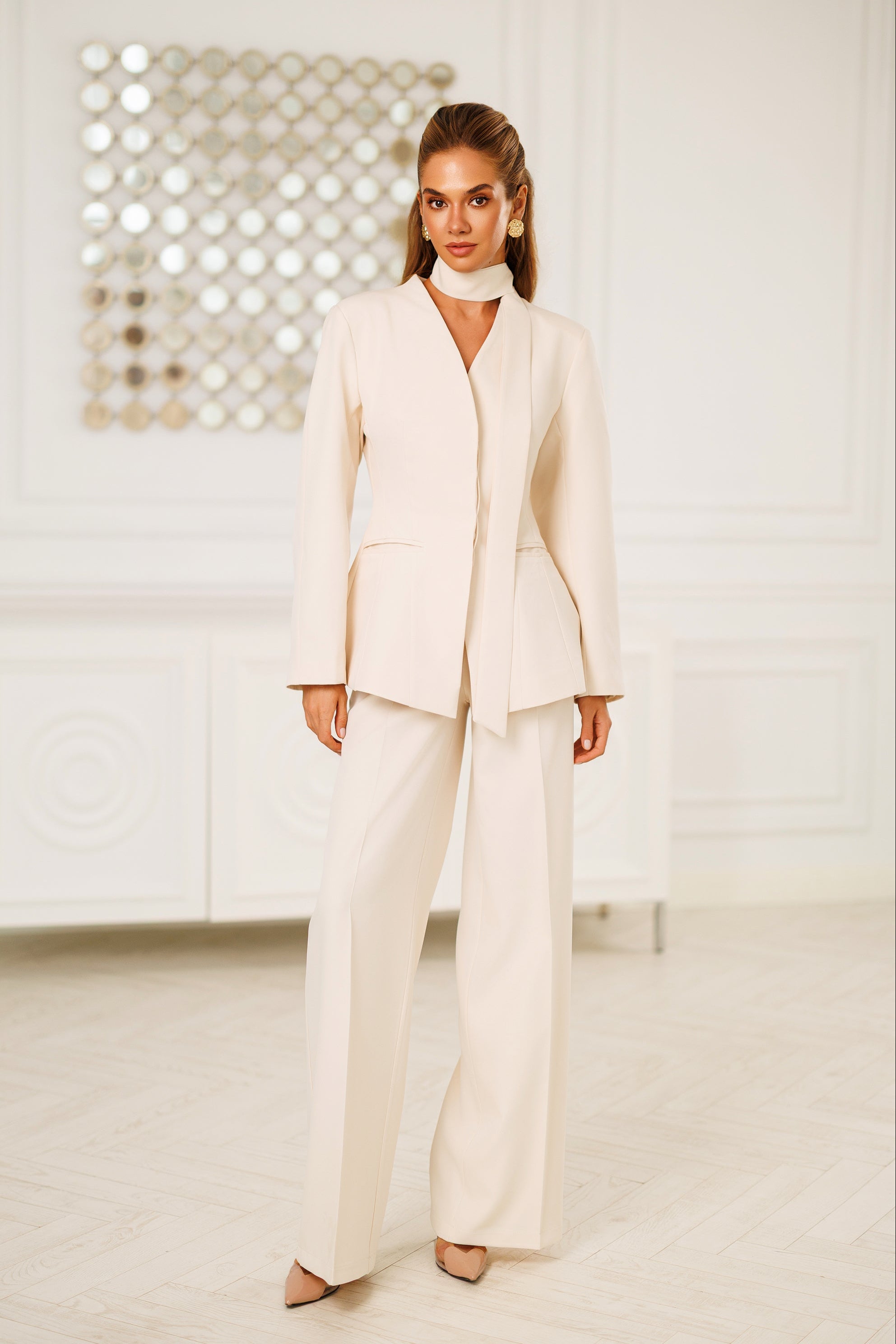 Beige Scarf-Neck Single-Breasted Suit 2-Piece