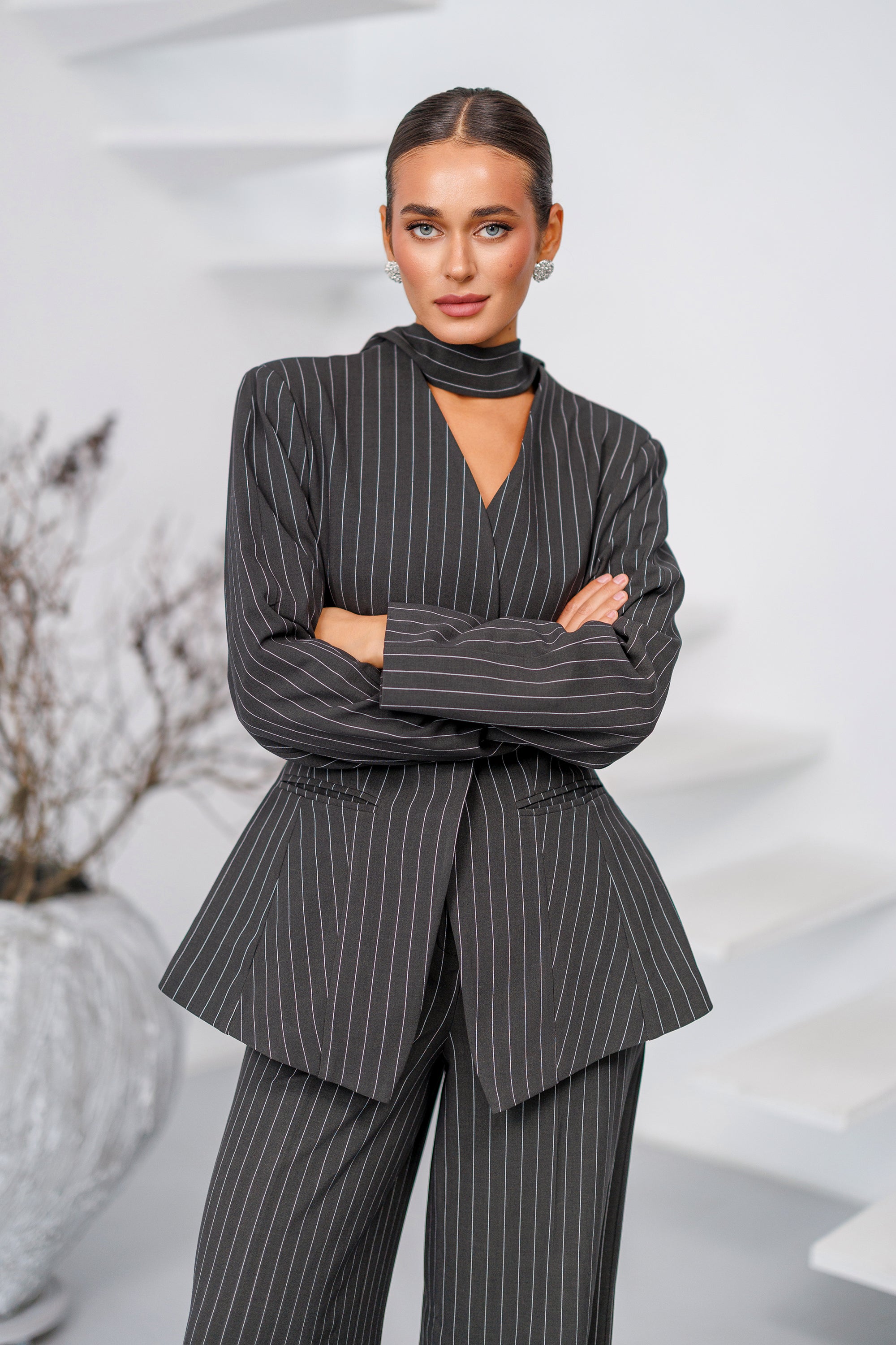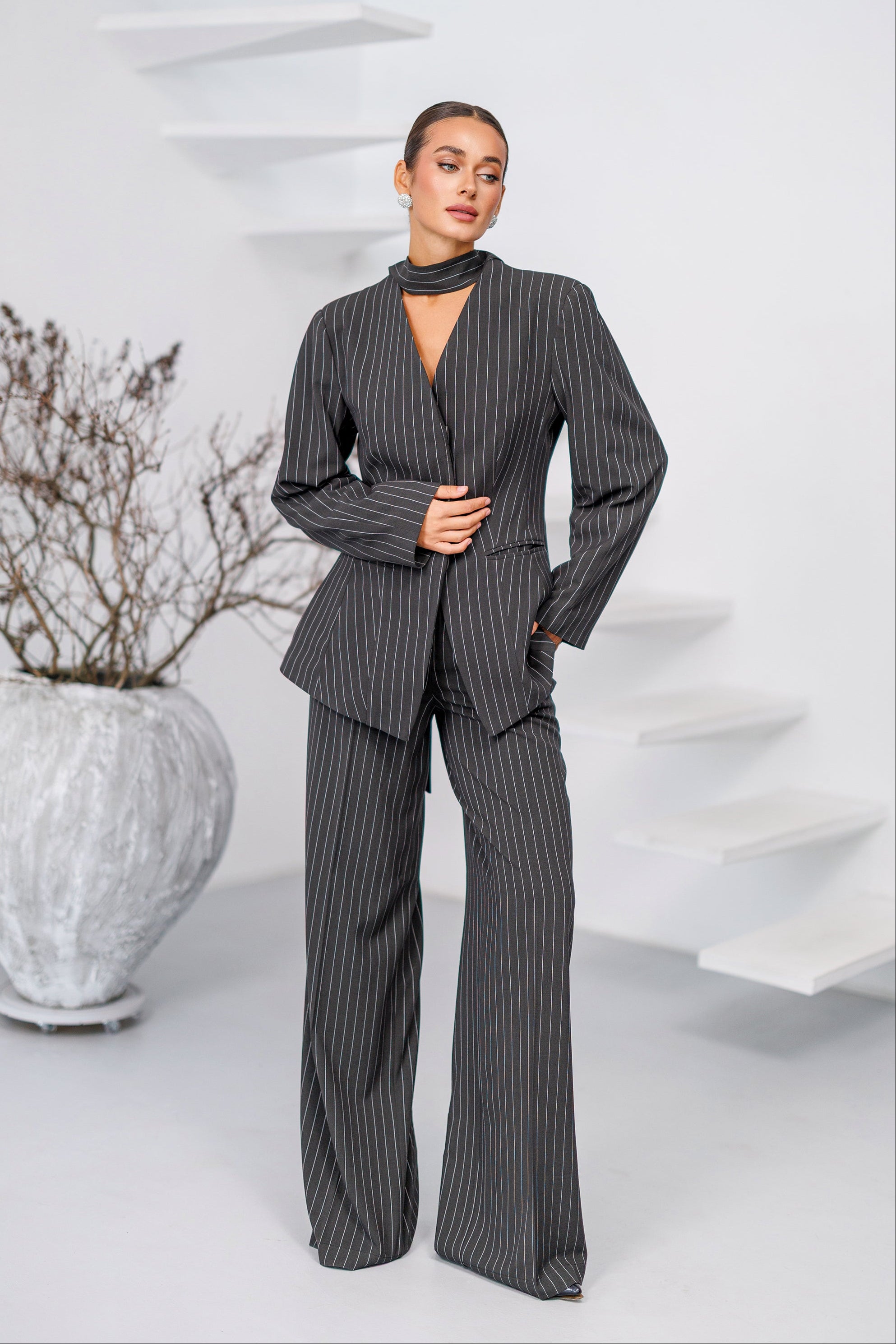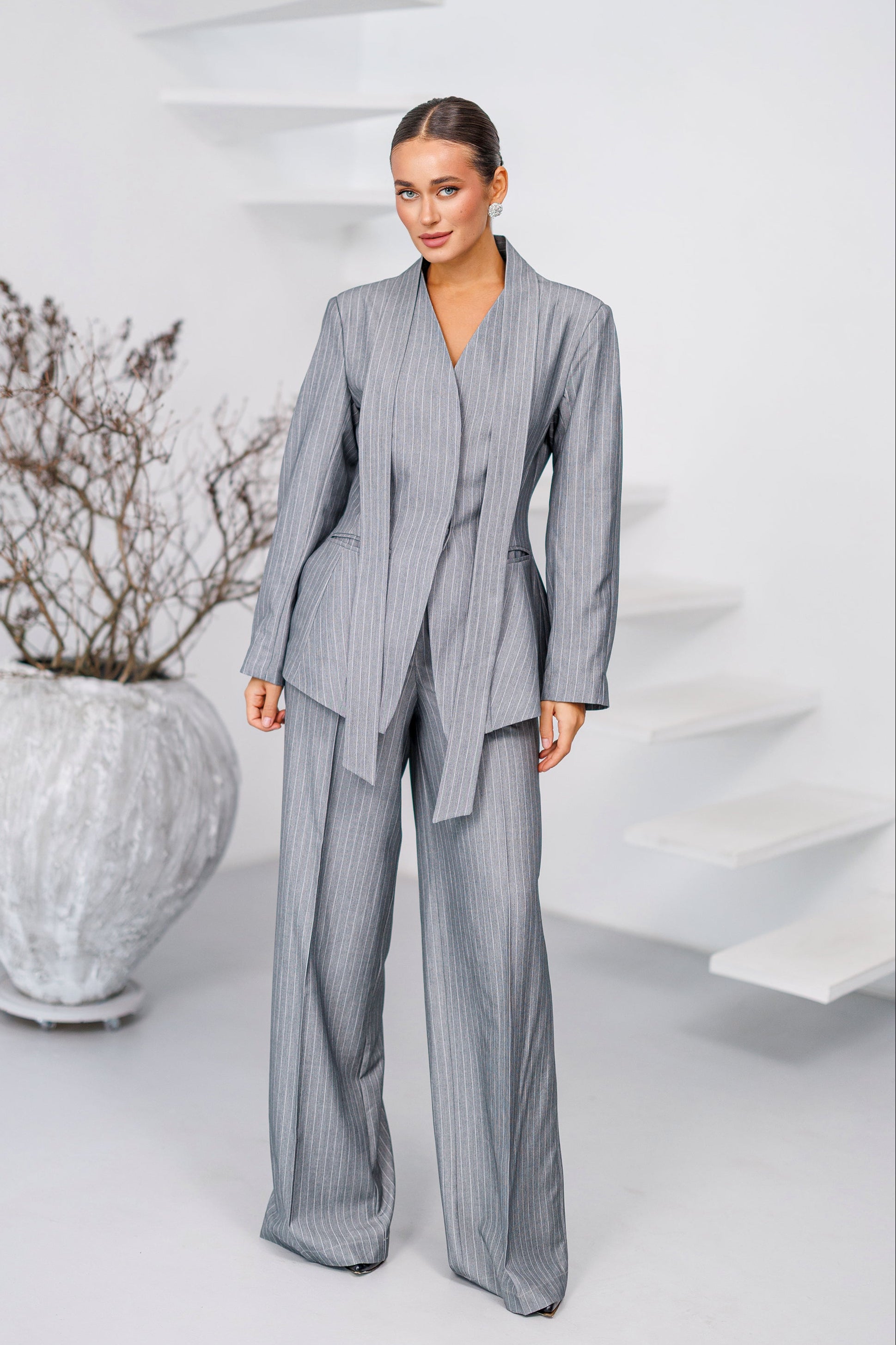 Grey Striped Scarf-Neck Single-Breasted Suit 2-Piece