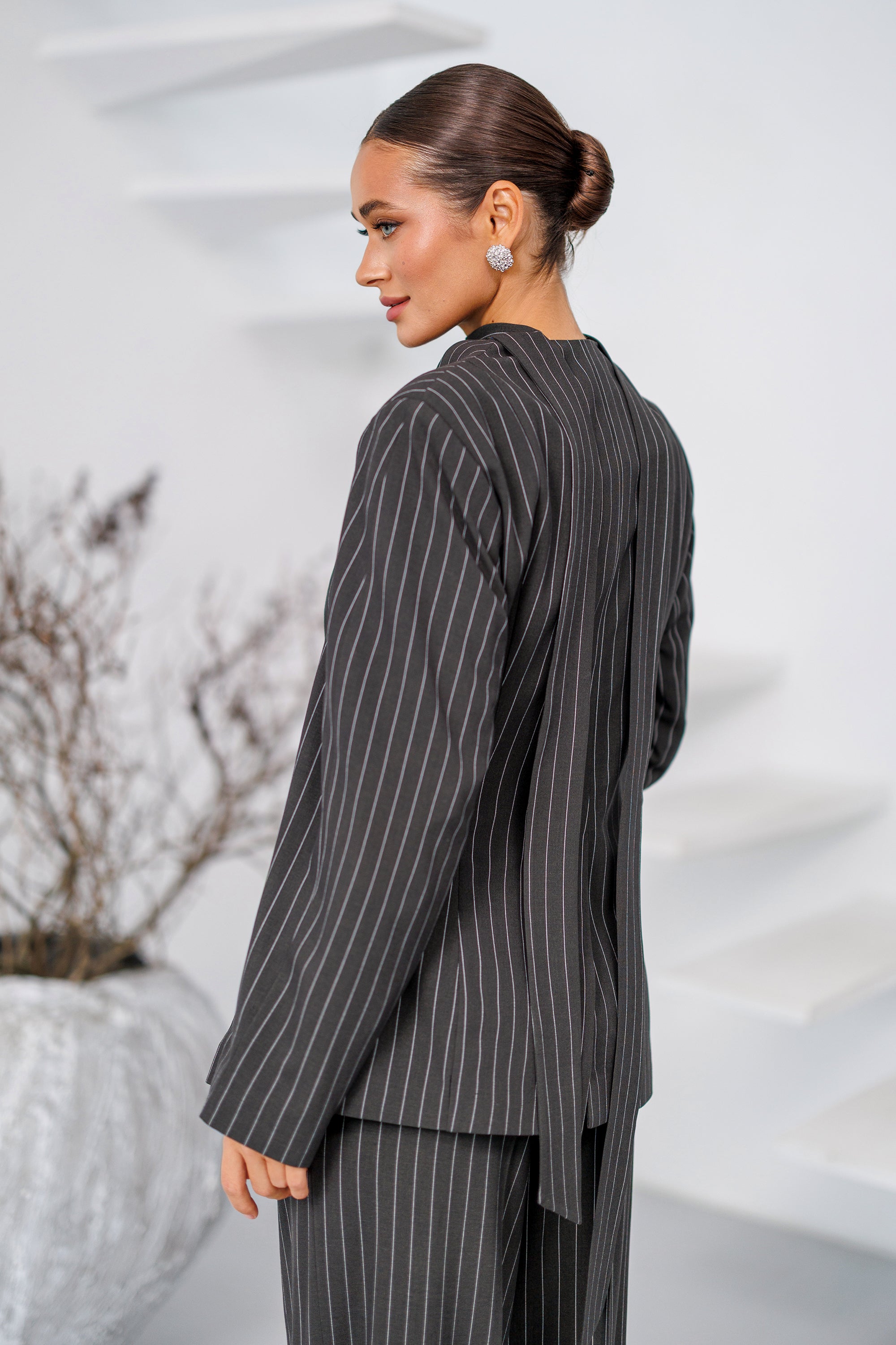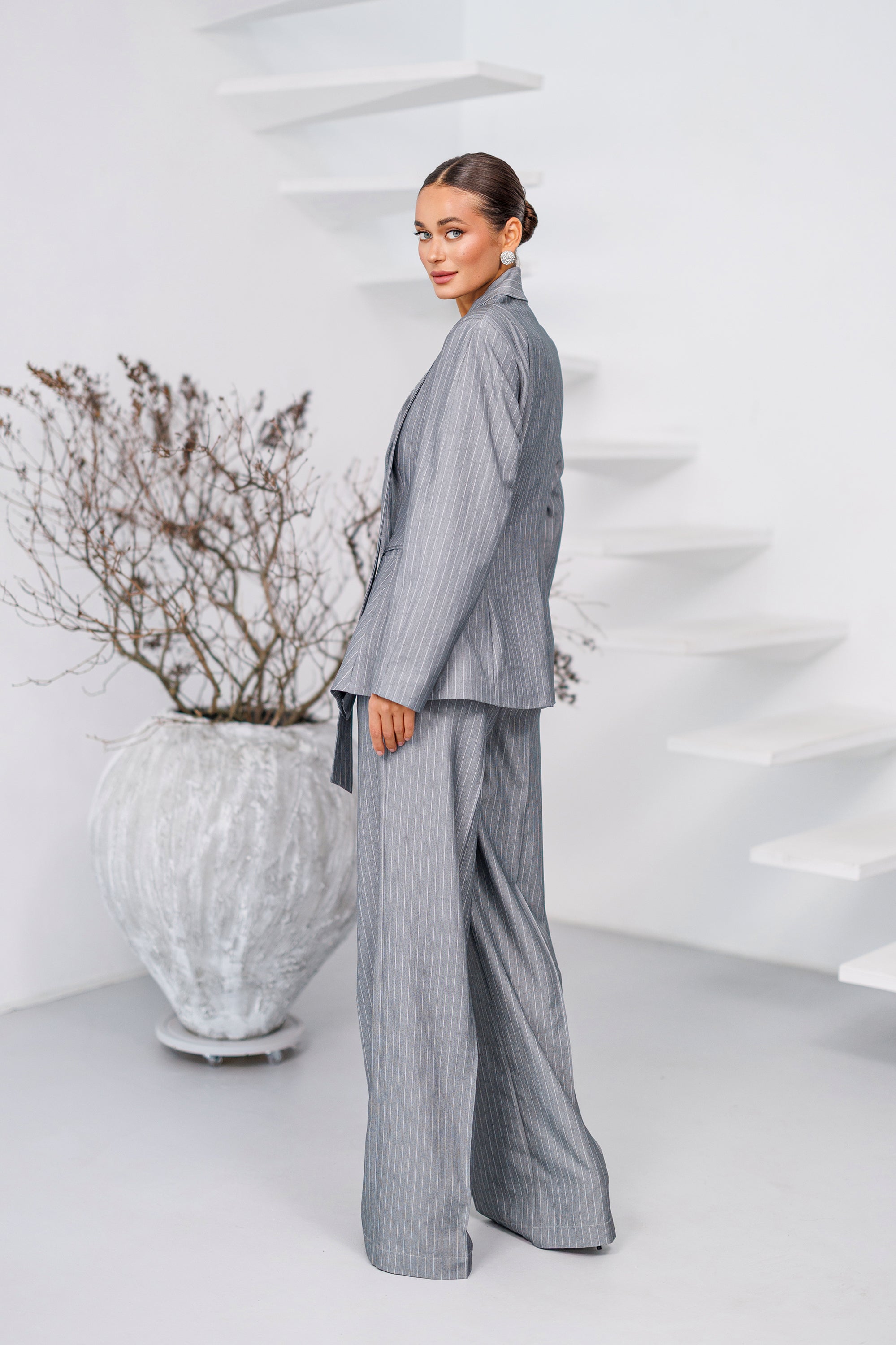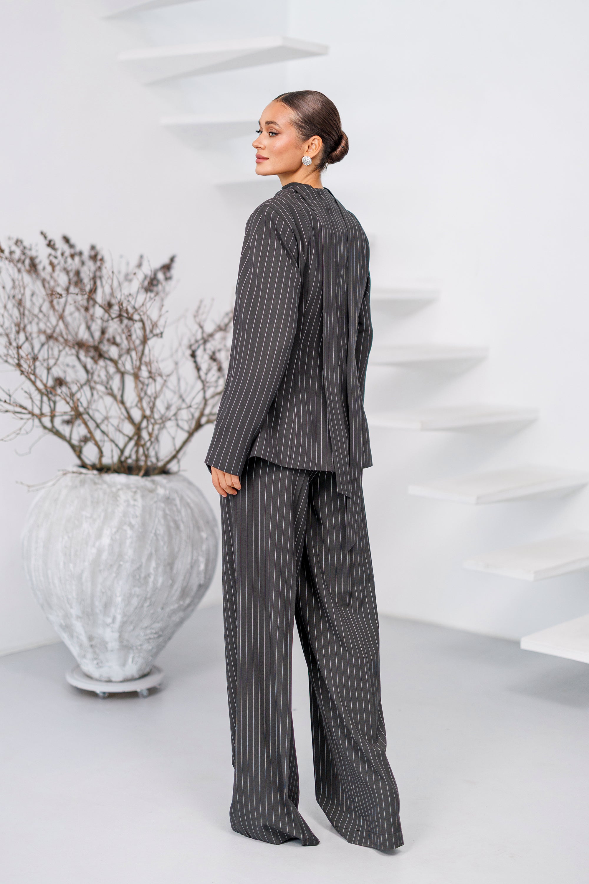 Grey Striped Scarf-Neck Single-Breasted Suit 2-Piece