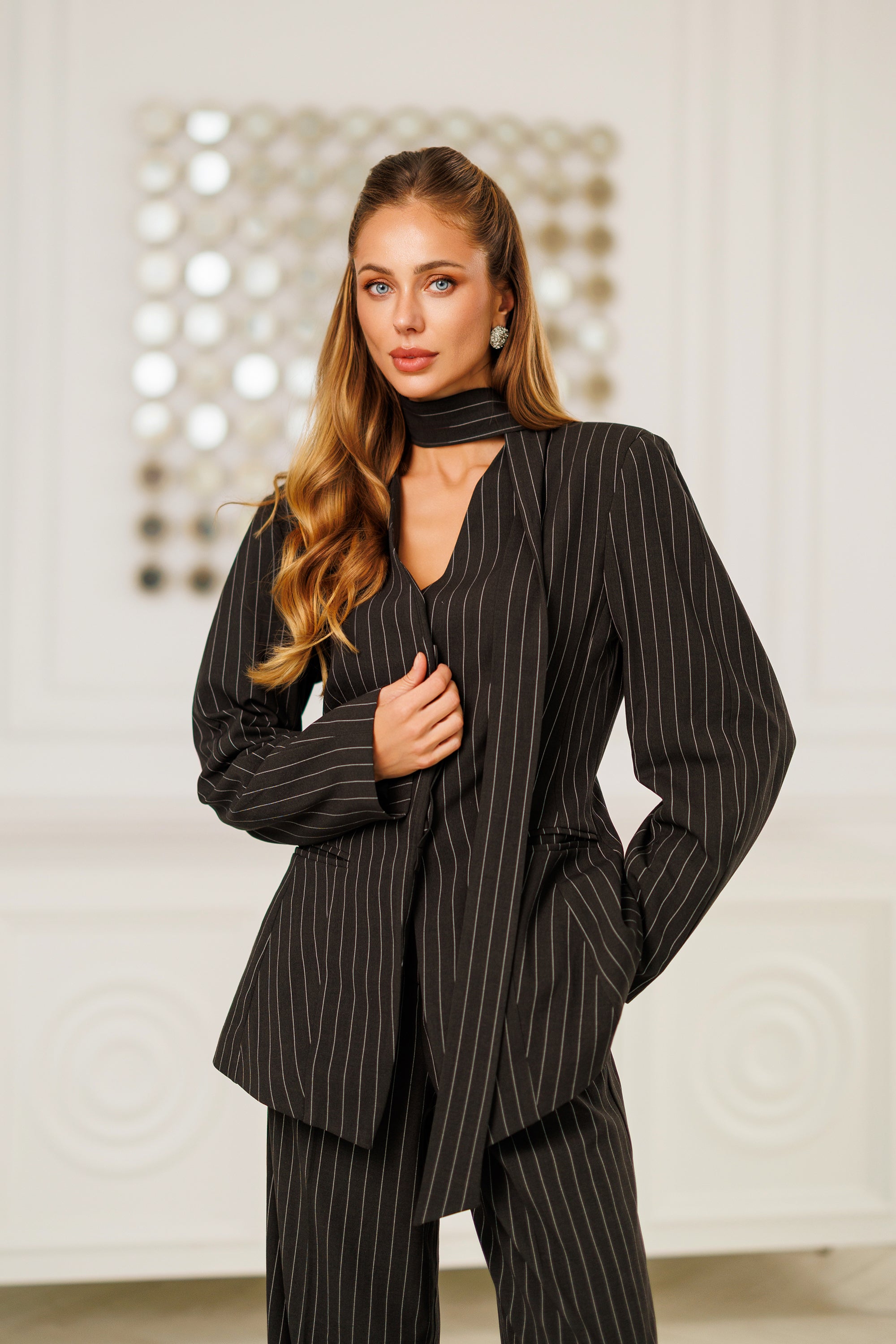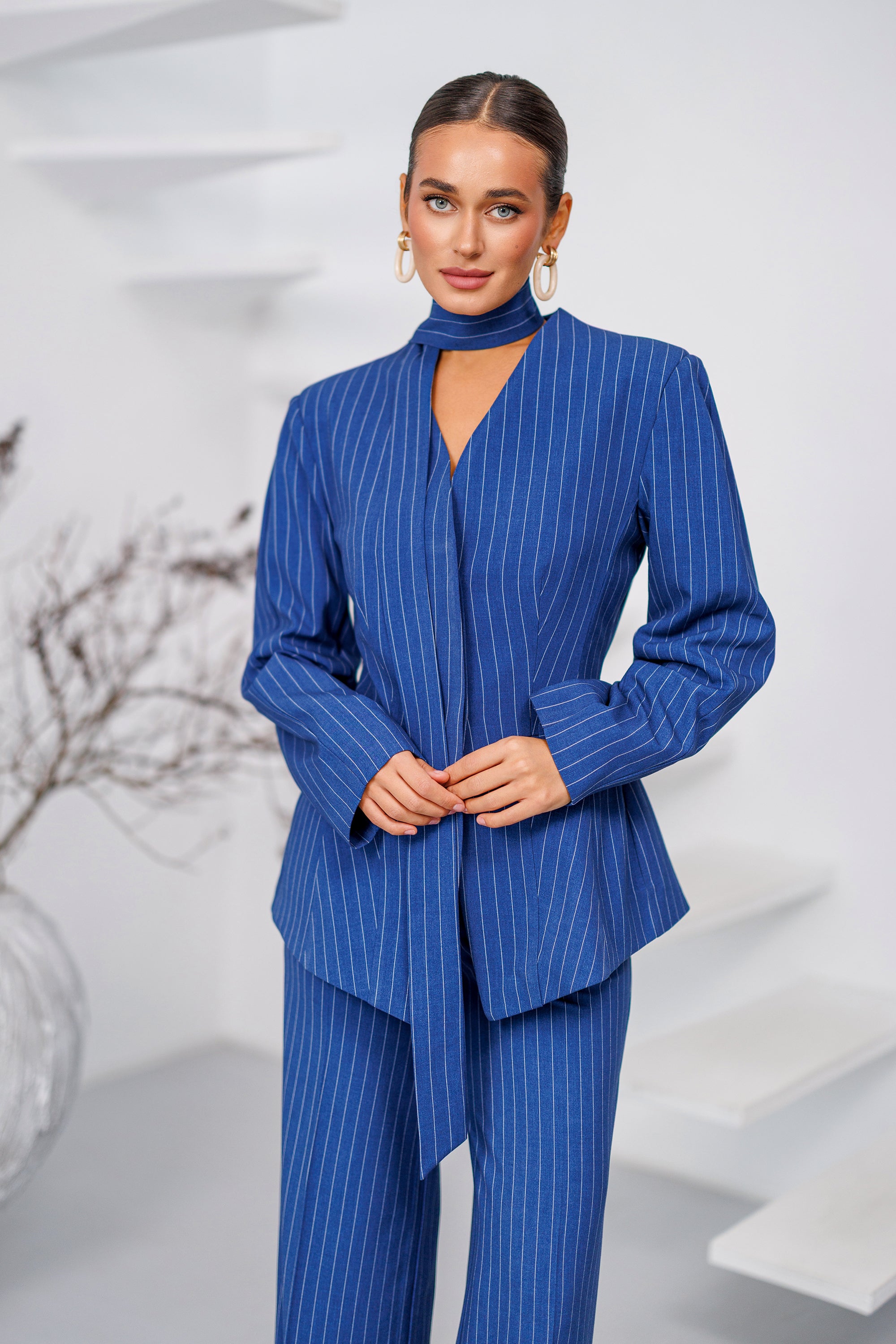 Navy Striped Scarf-Neck Single-Breasted Suit 2-Piece