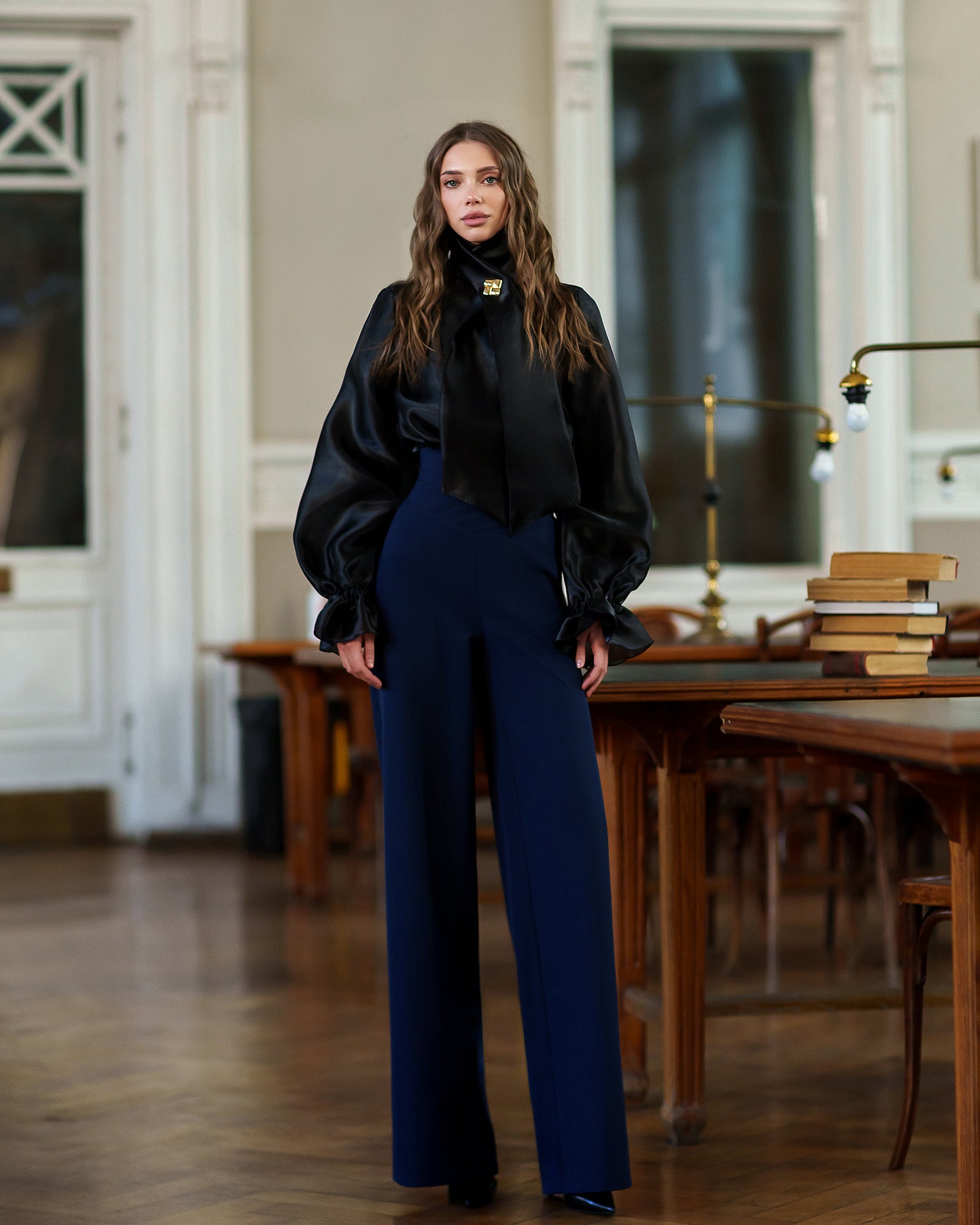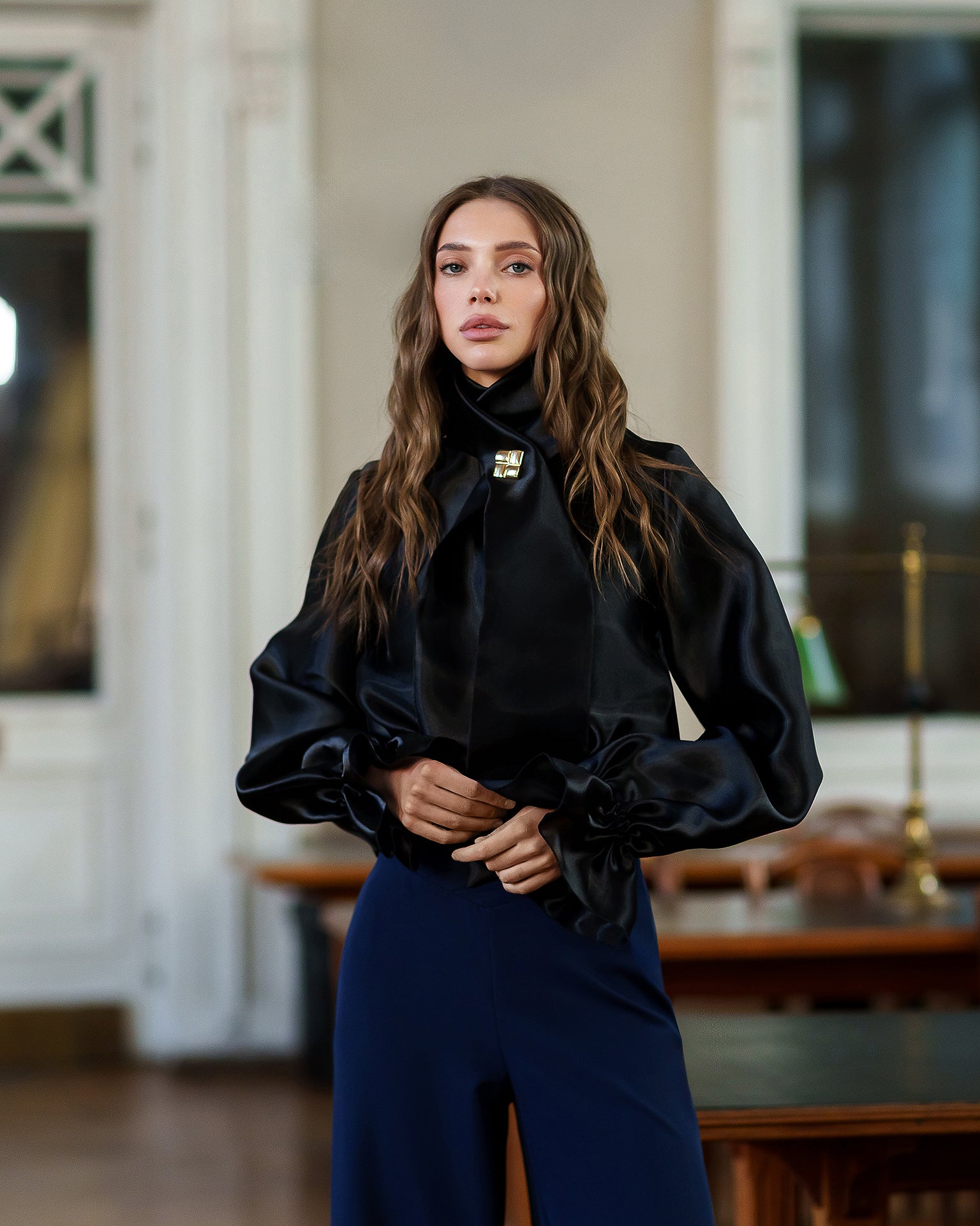 Black Sheer Organza Bow-Neck Puff Sleeve Blouse