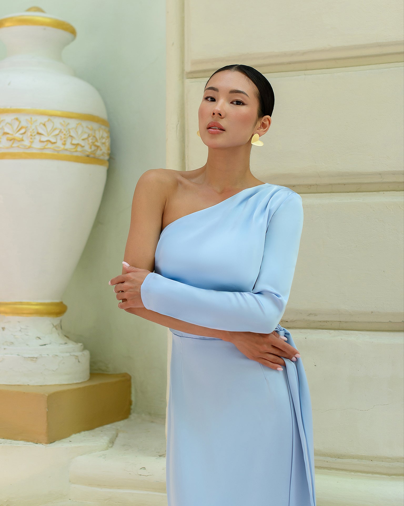 Sky-Blue Satin One-Shoulder Cut-Out Midi Dress