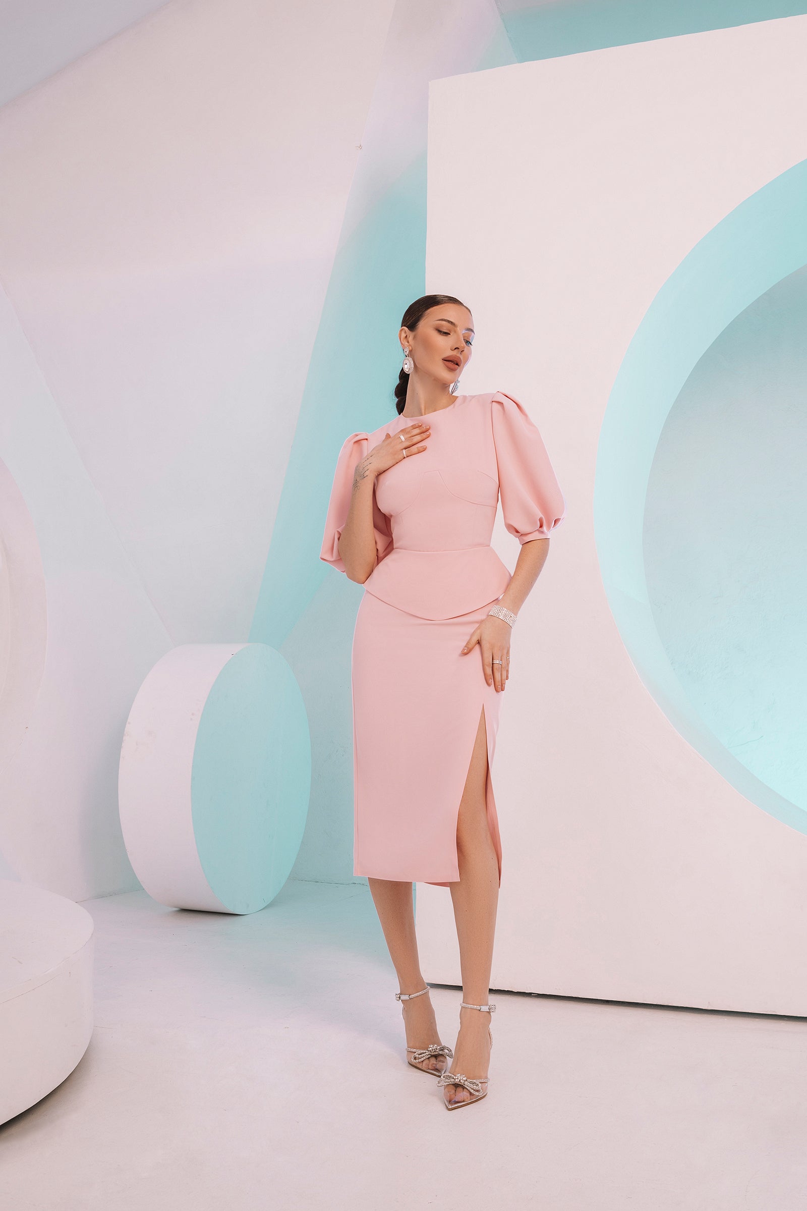 Pink Puff-Sleeve Top & Midi Skirt 2-Piece Set
