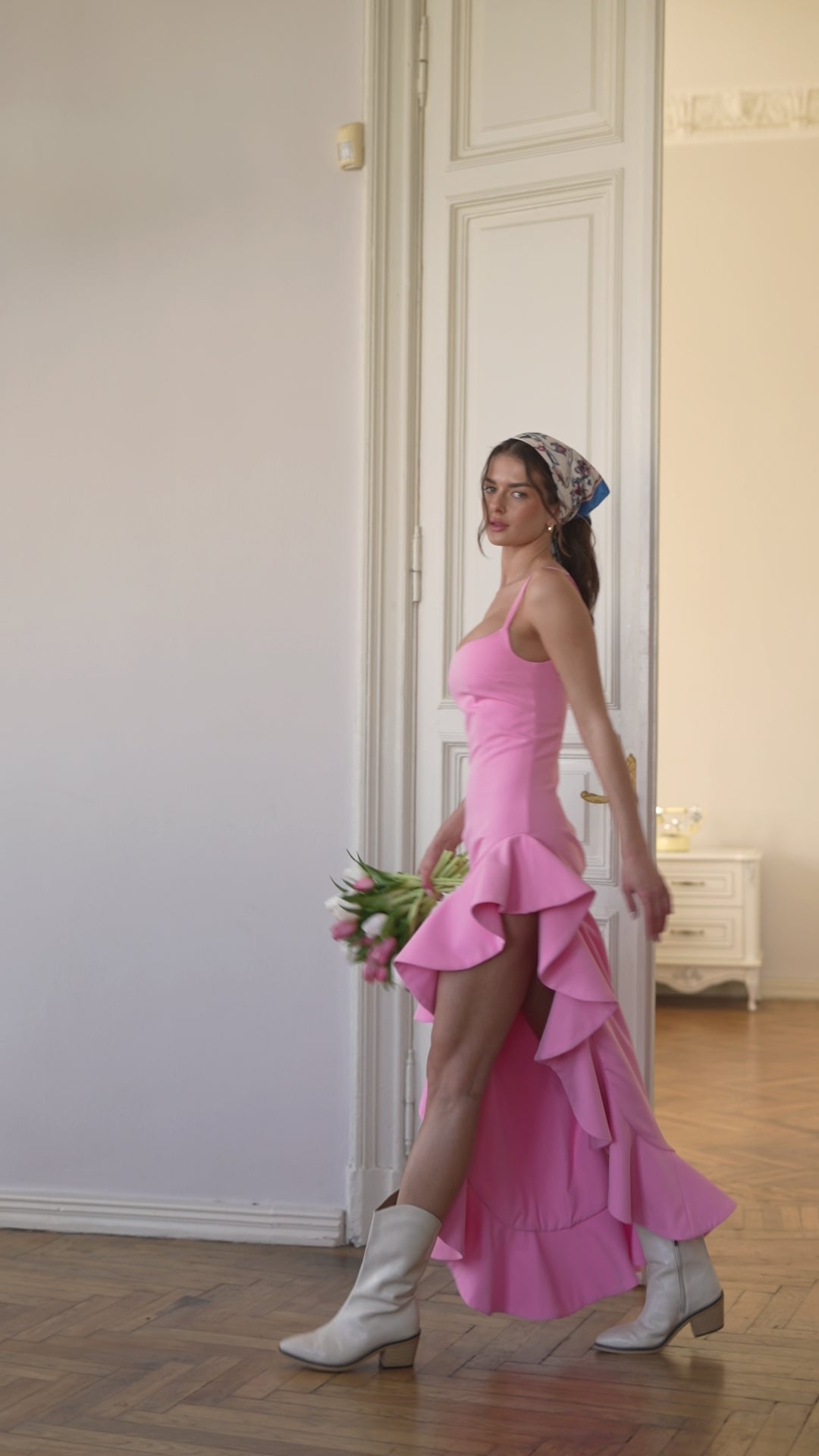 Bianca Dusty-Pink Asymmetric Ruffled Slip Midi Dress