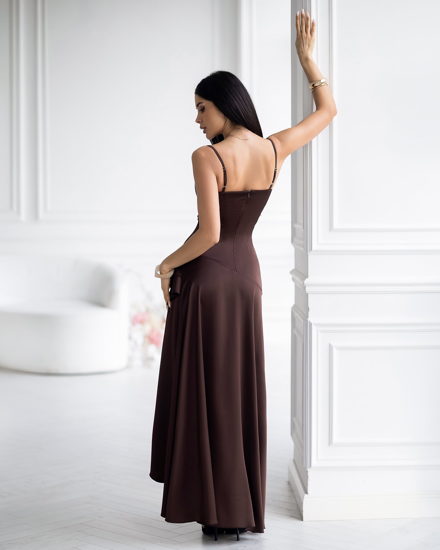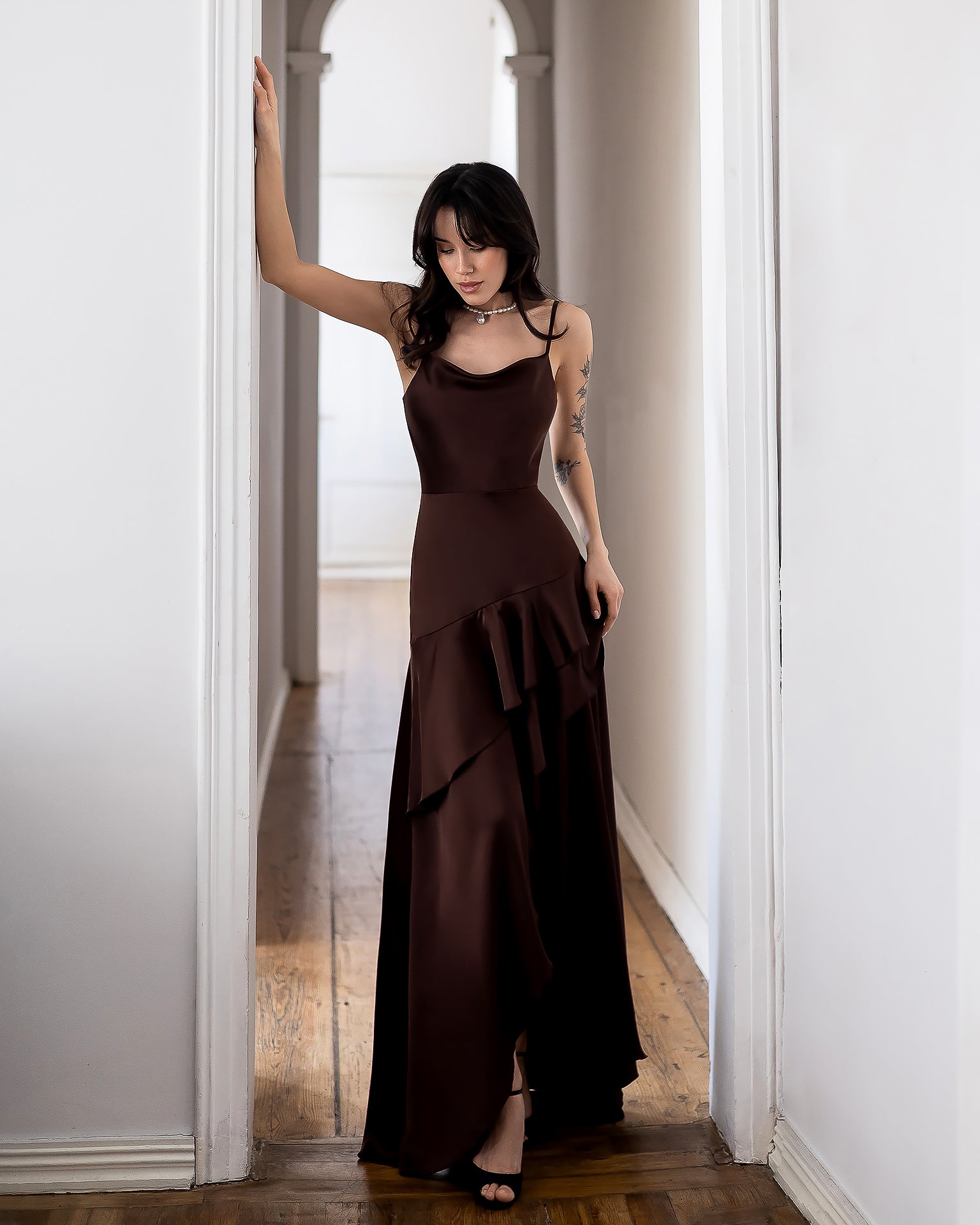 Lina Brown Satin Strappy Asymmetric Ruffle Maxi Dress