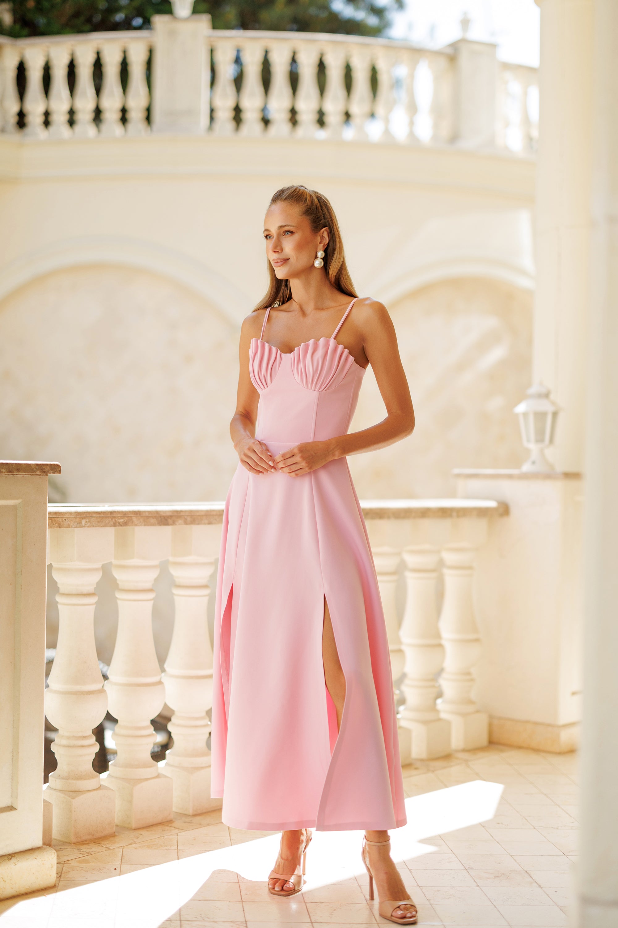 Pink Shell-Pleated Bustier Spaghetti Strap Midi Dress