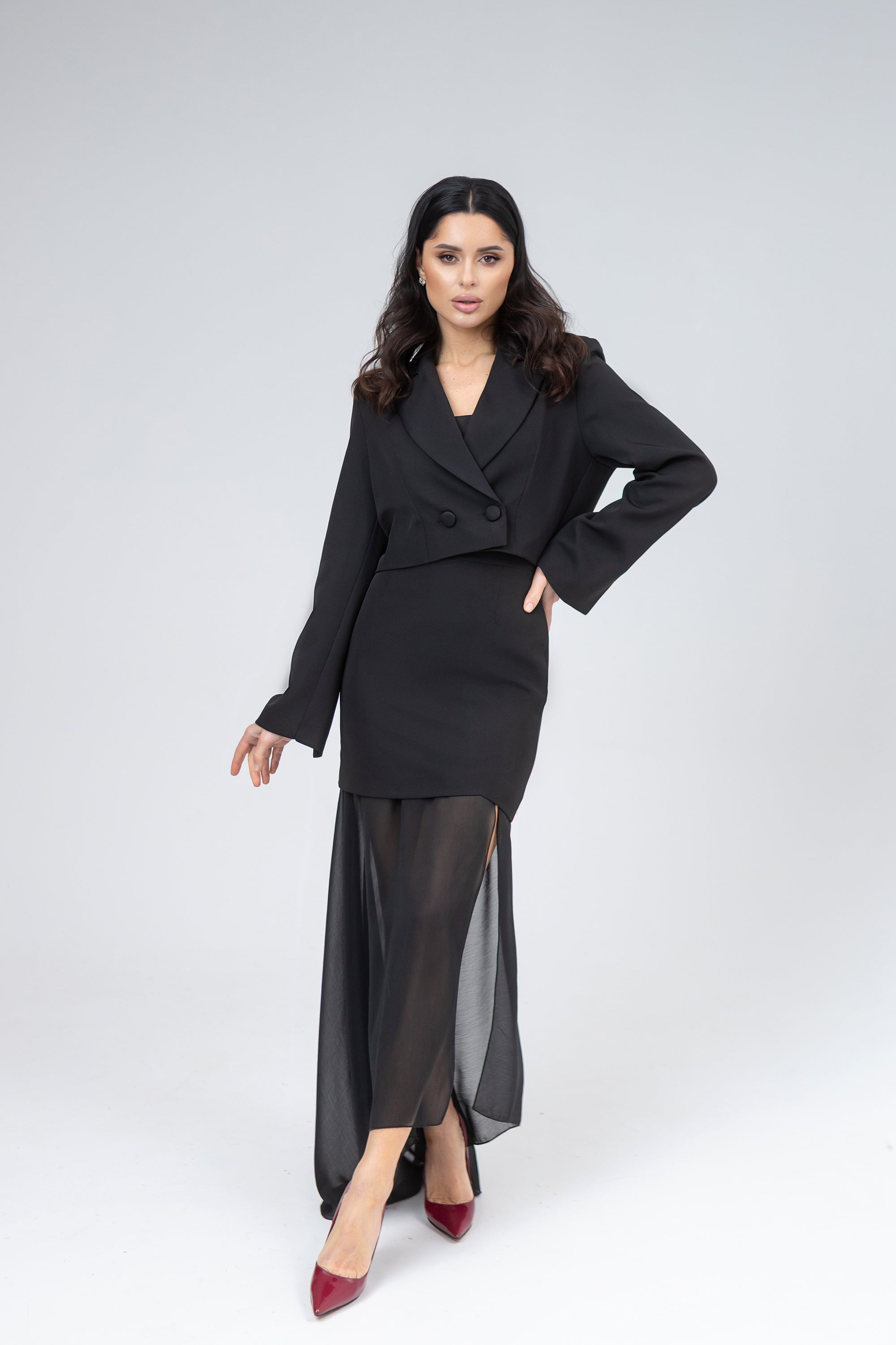 Black Crop Jacket Long Sheer Mini Skirt Suit 2-Piece Suit