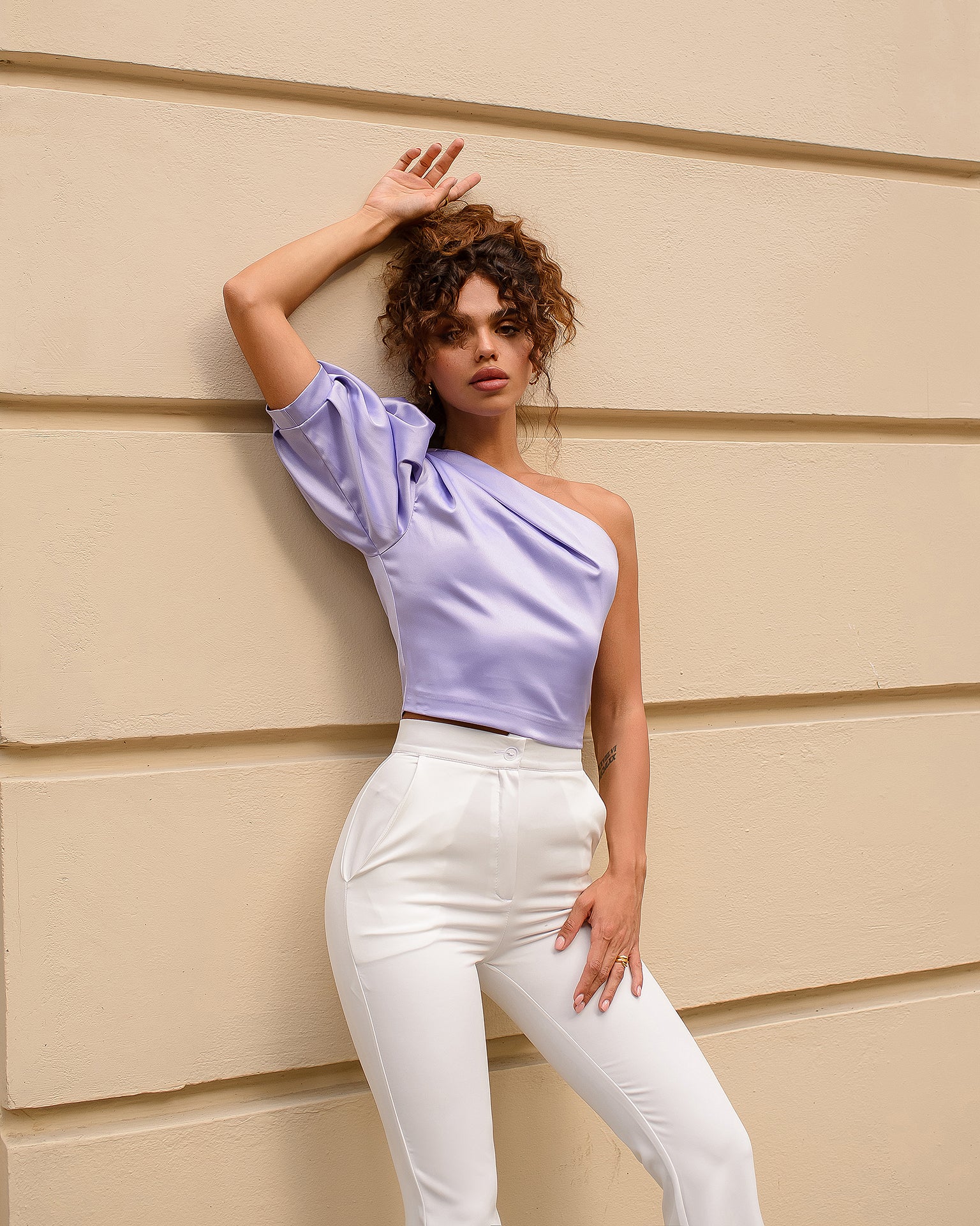 White Shawl Collar Puff-Sleeve Belted Tunic Blouse