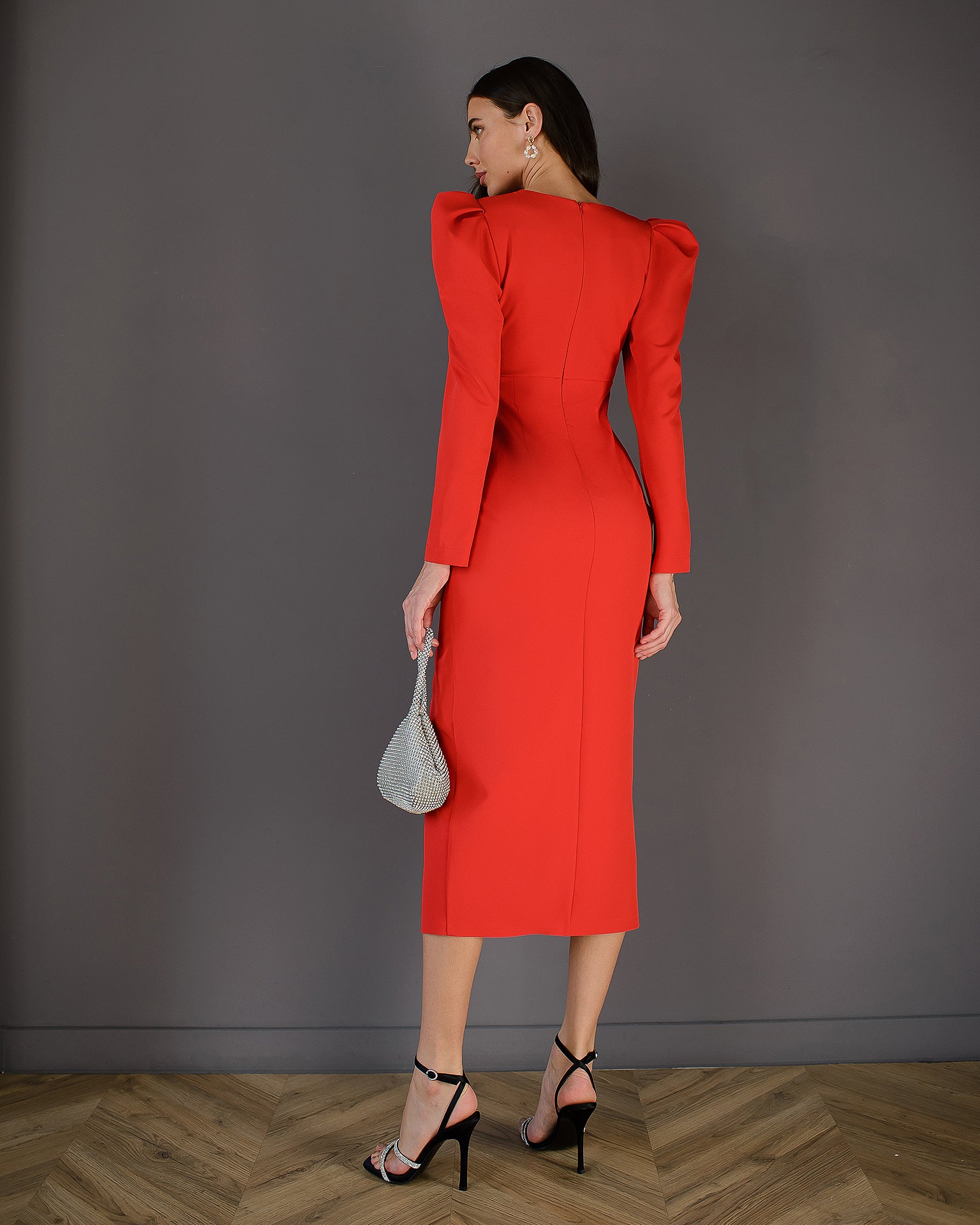 Alexa Red Round Neck Puff-Sleeve Midi Dress