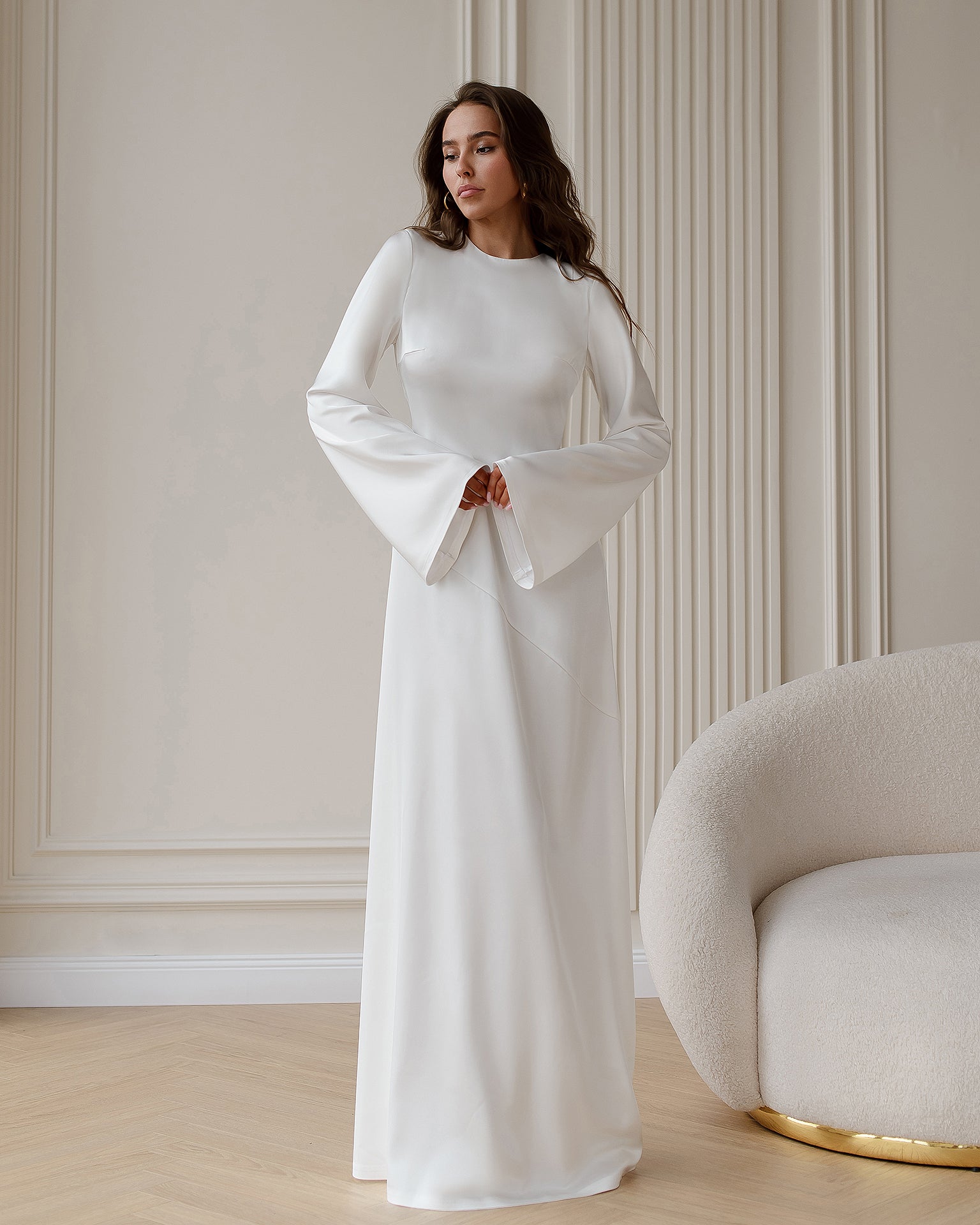 White Satin Long Sleeve Midi Dress