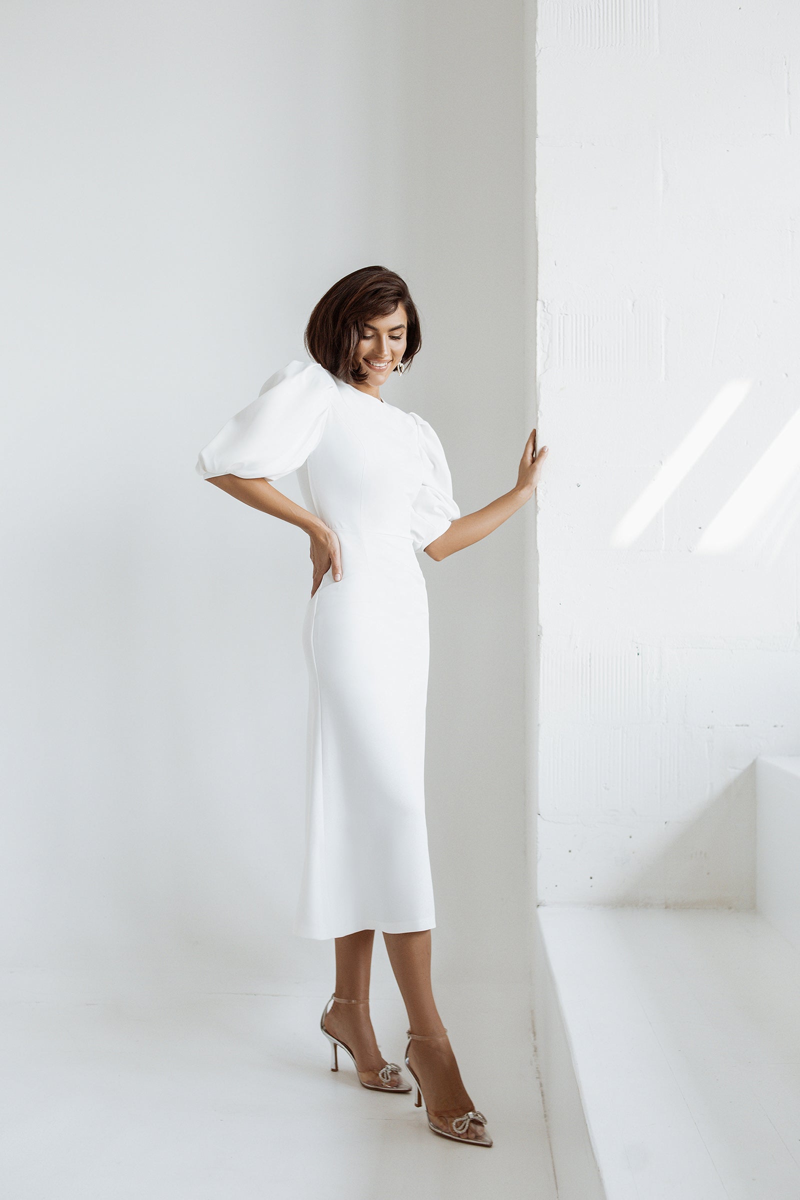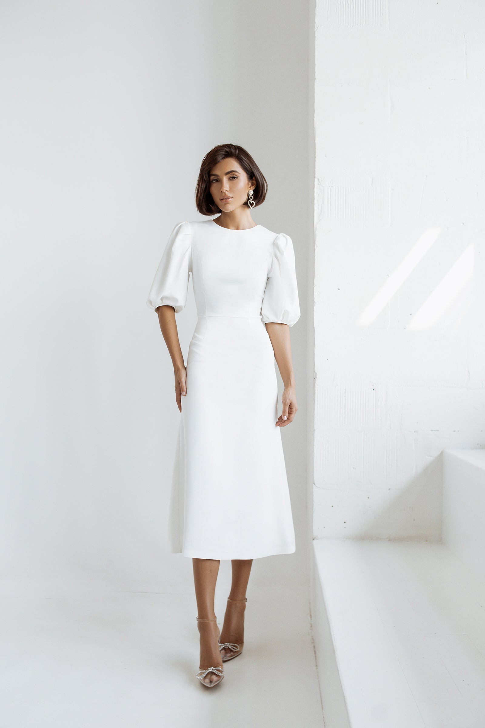White Puff-Sleeve Midi Dress