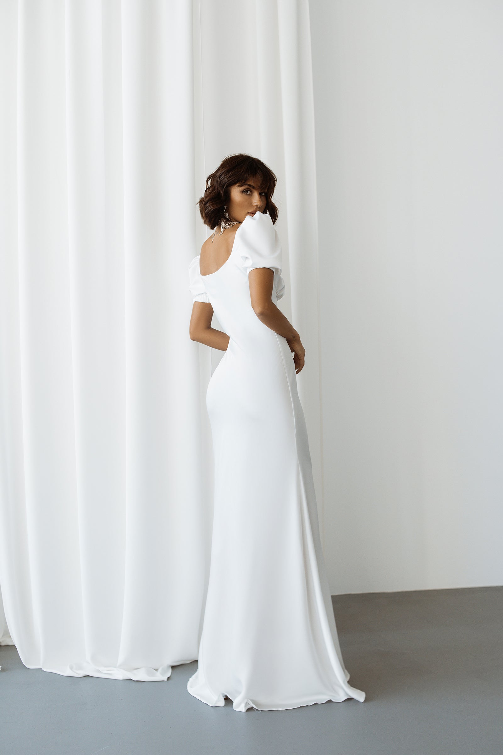 White Satin Puff-Sleeve Bridal Maxi Dress