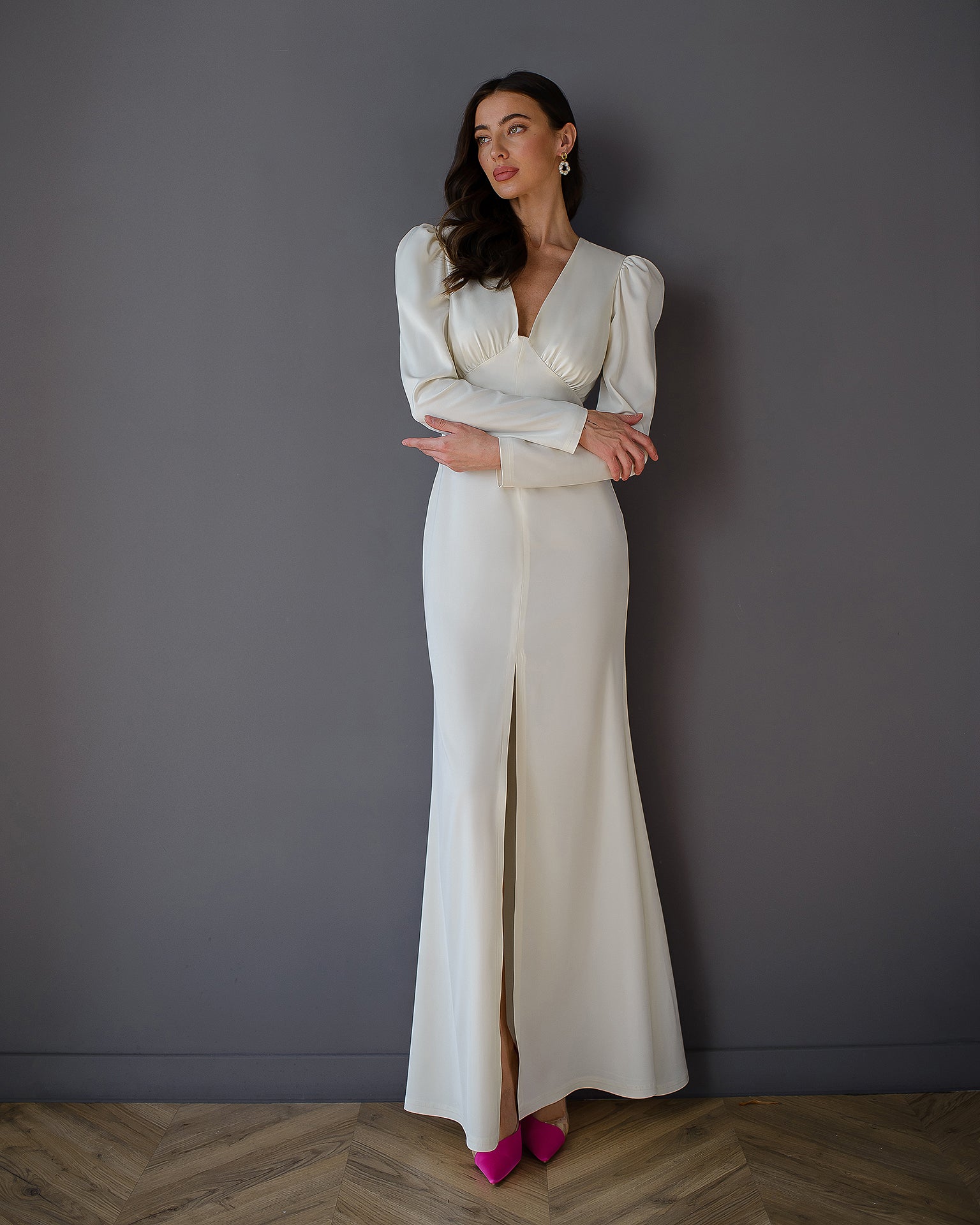 Yellow V-Neck Puff-Sleeve Midi Dress