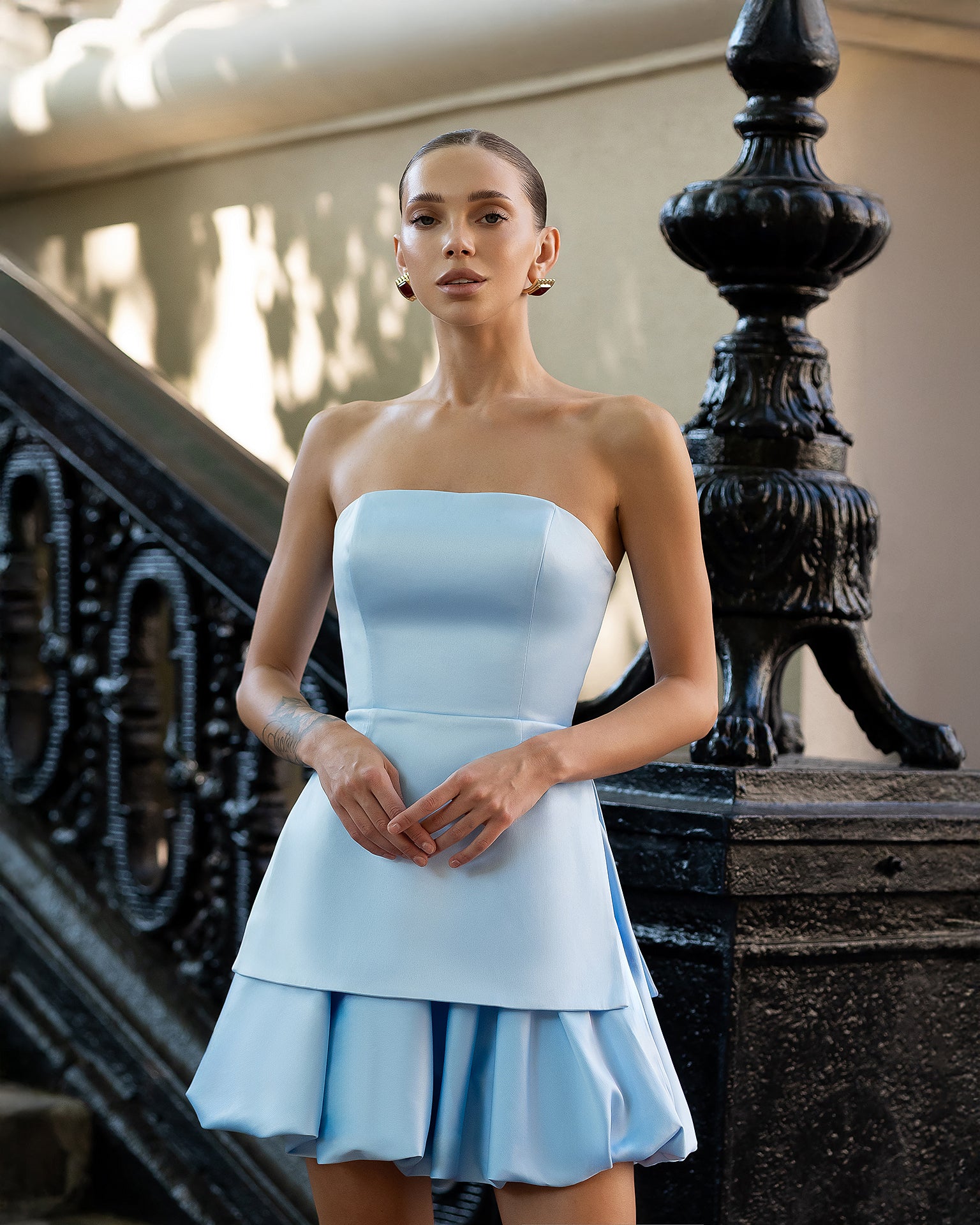Sky-Blue Satin Strapless Peplum Top & Bubble-Hem Mini Skirt