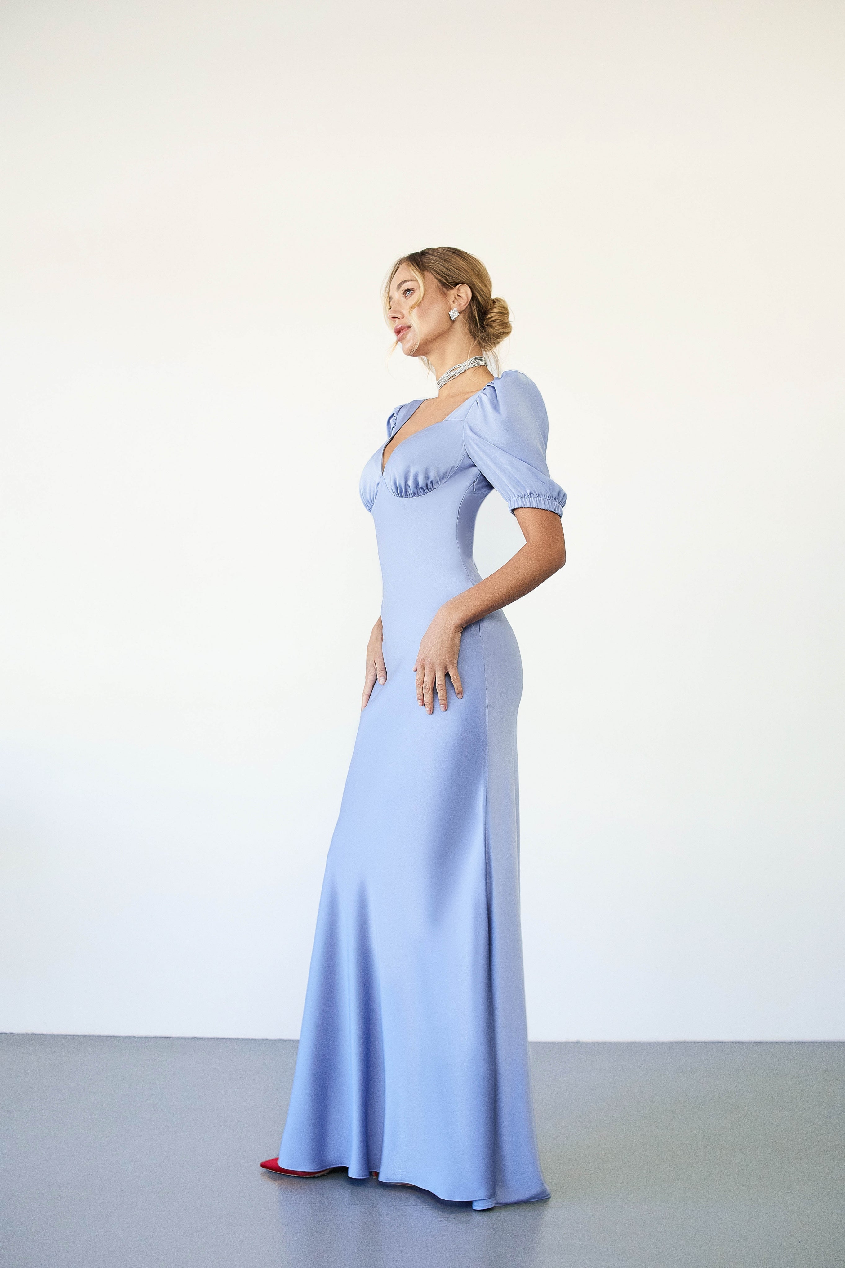 Sky-Blue Satin Puff Sleeve Maxi Dress