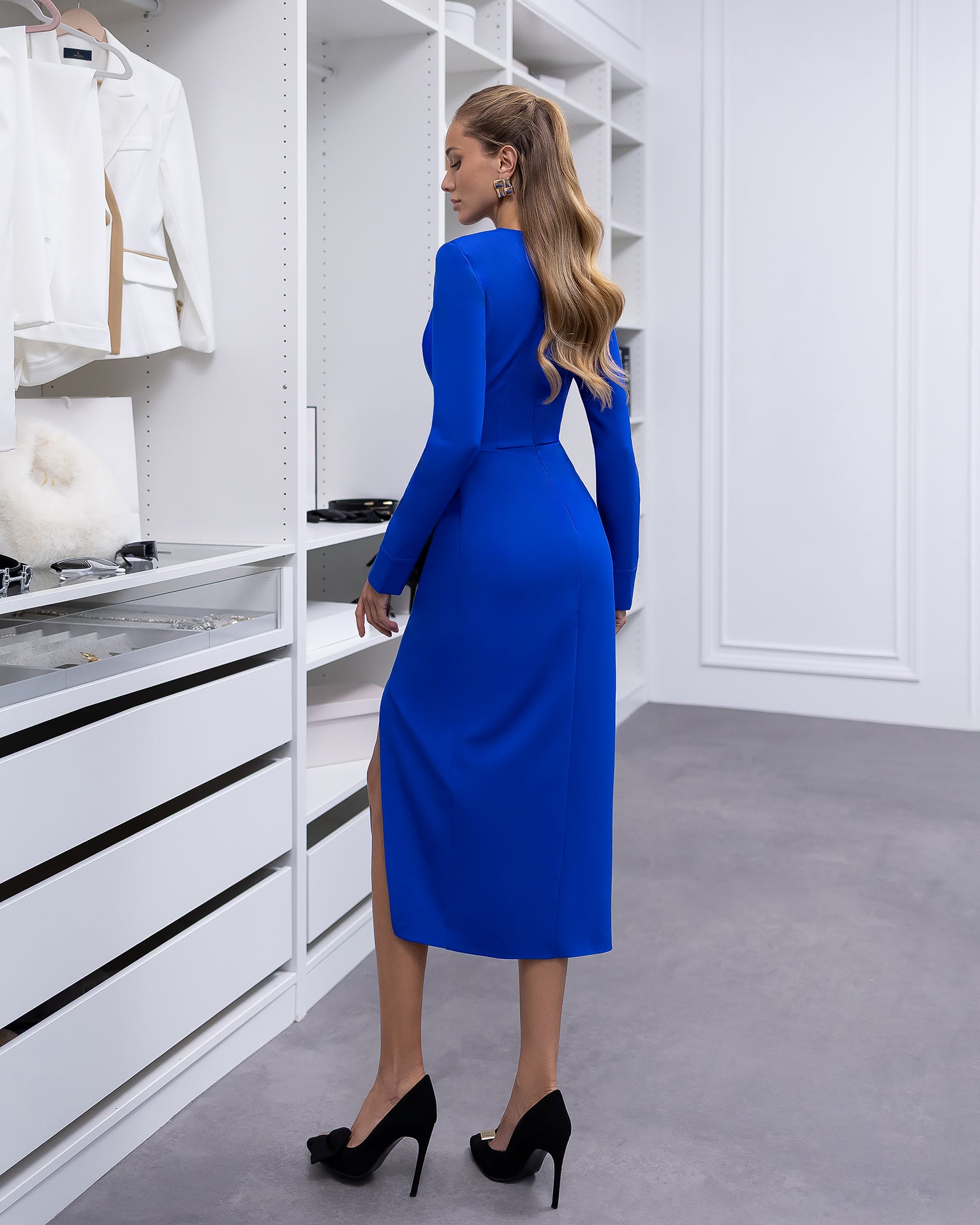 Estelle Blue Long-Sleeve Slit Midi Dress
