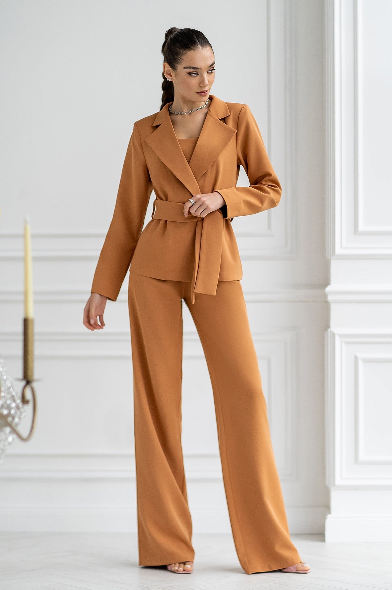 - Included: jacket, corseted crop top, wide-leg pants and belt