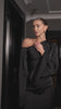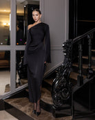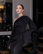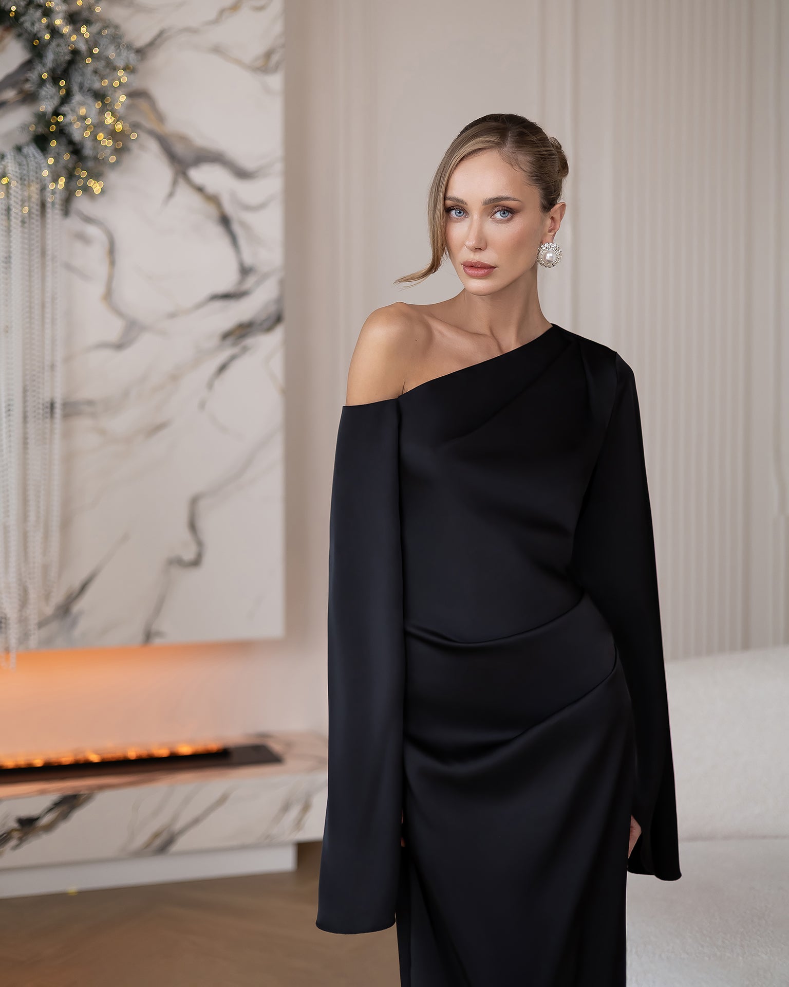 Celeste Black Satin Asymmetric One-Shoulder Midi Dress