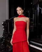 Red Strapless Back Scarf Overskirt Maxi Dress