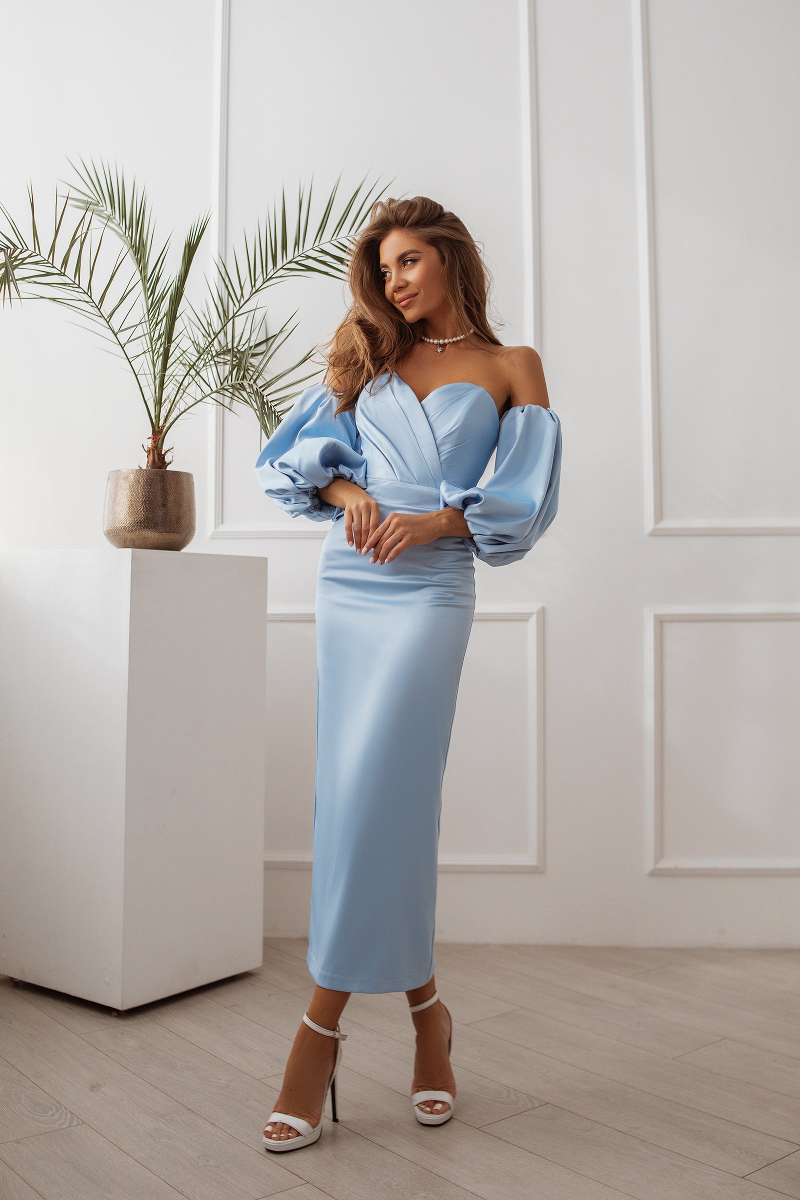 Sky-Blue Puffed Sleeve Midi Prom Dress