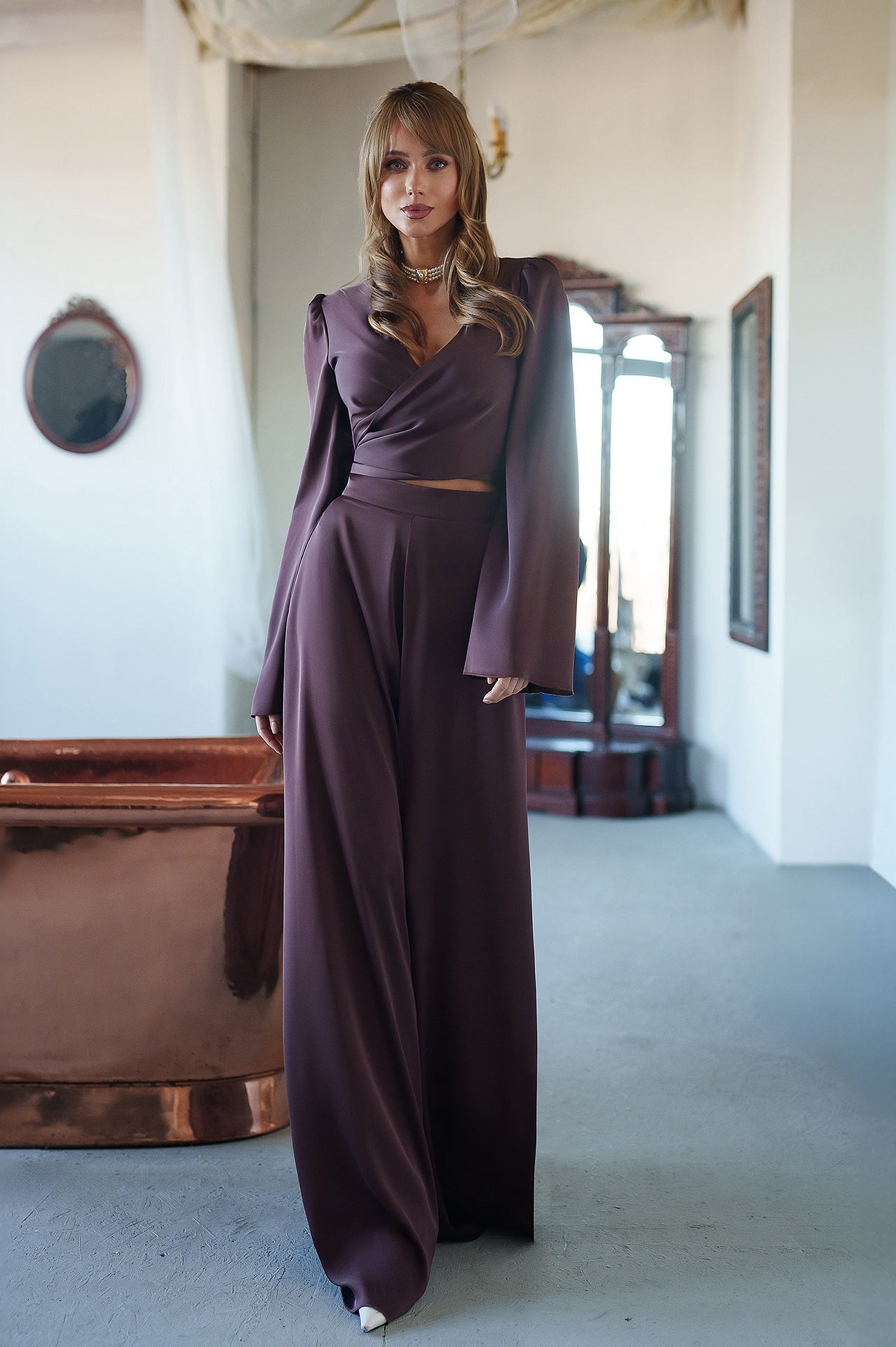 Brown Satin Bell-Sleeve Wrap Top & Wide-Leg Pants 2-Piece Set