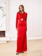 Elara Red Satin Long-Sleeve Cut-Out Maxi Dress
