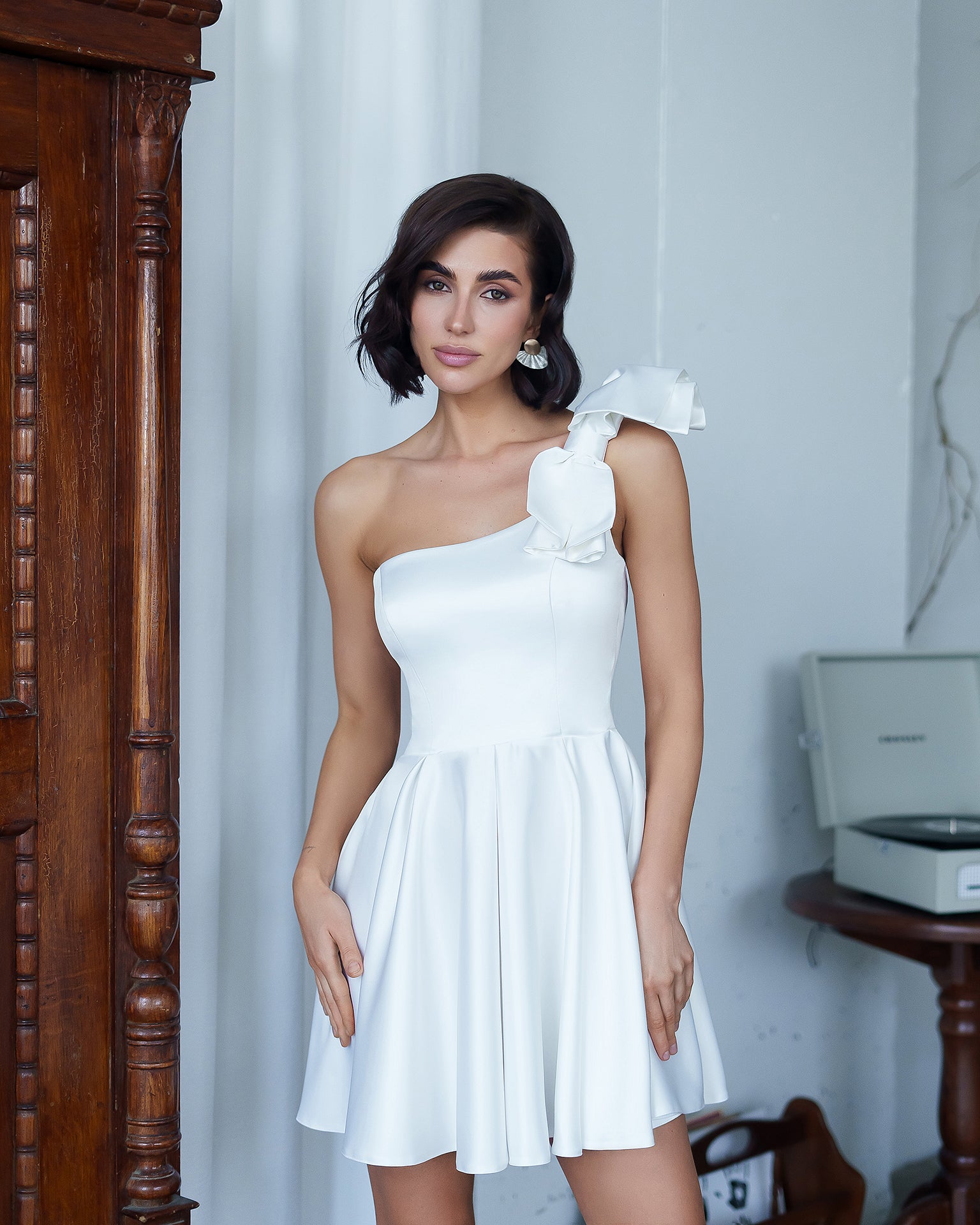 White Satin One-Shoulder Bow Skater Mini Dress