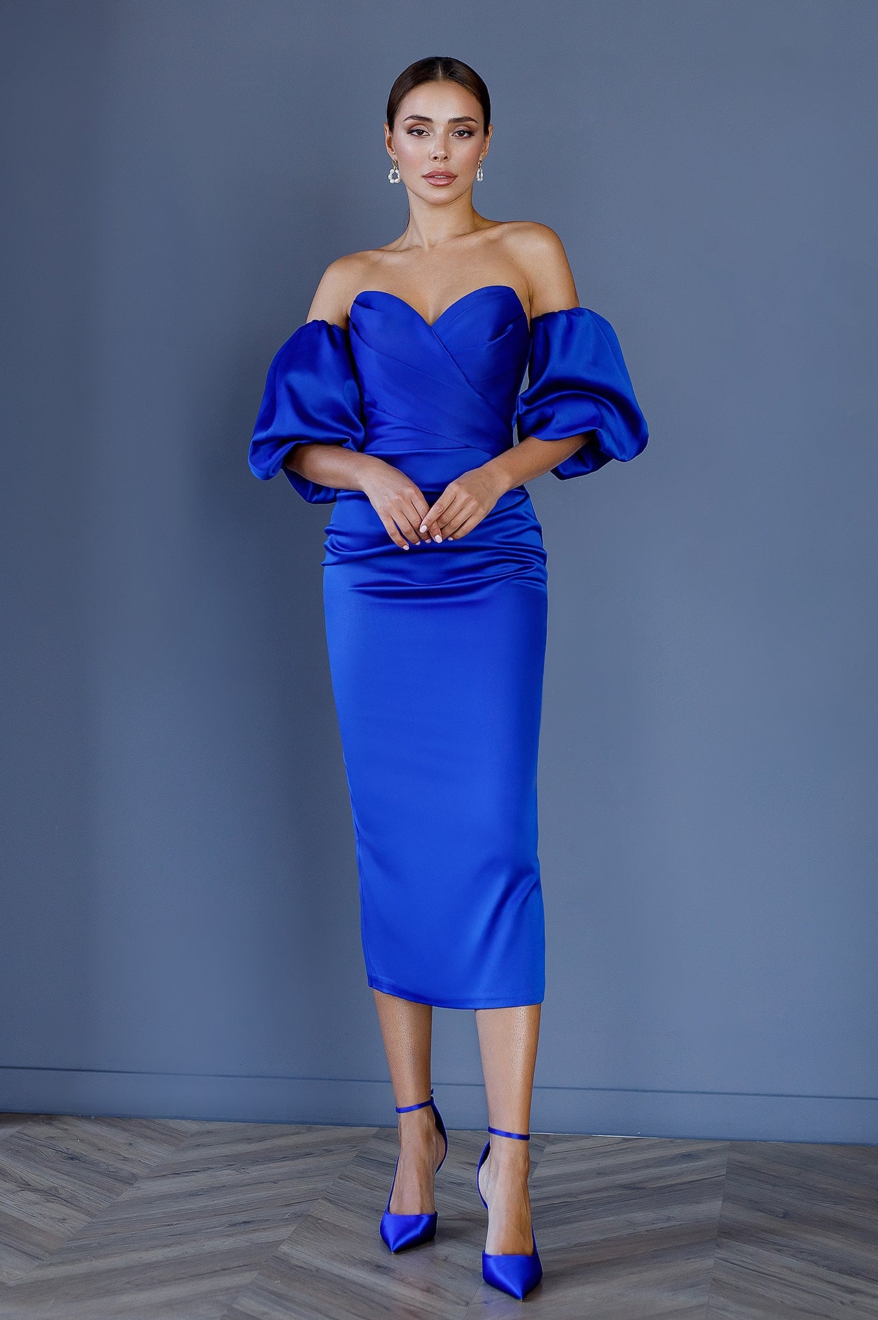 Blue Satin Sweetheart Puff-Sleeve Midi Dress