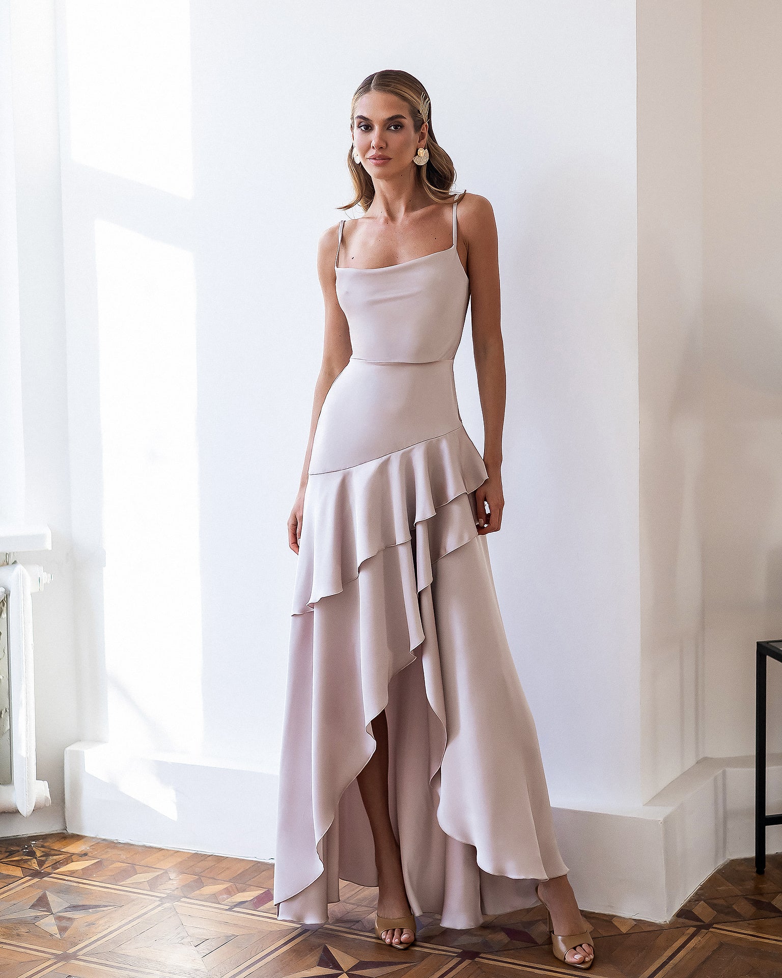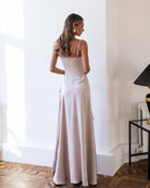 Lina Beige Satin Strappy Asymmetric Ruffle Maxi Dress
