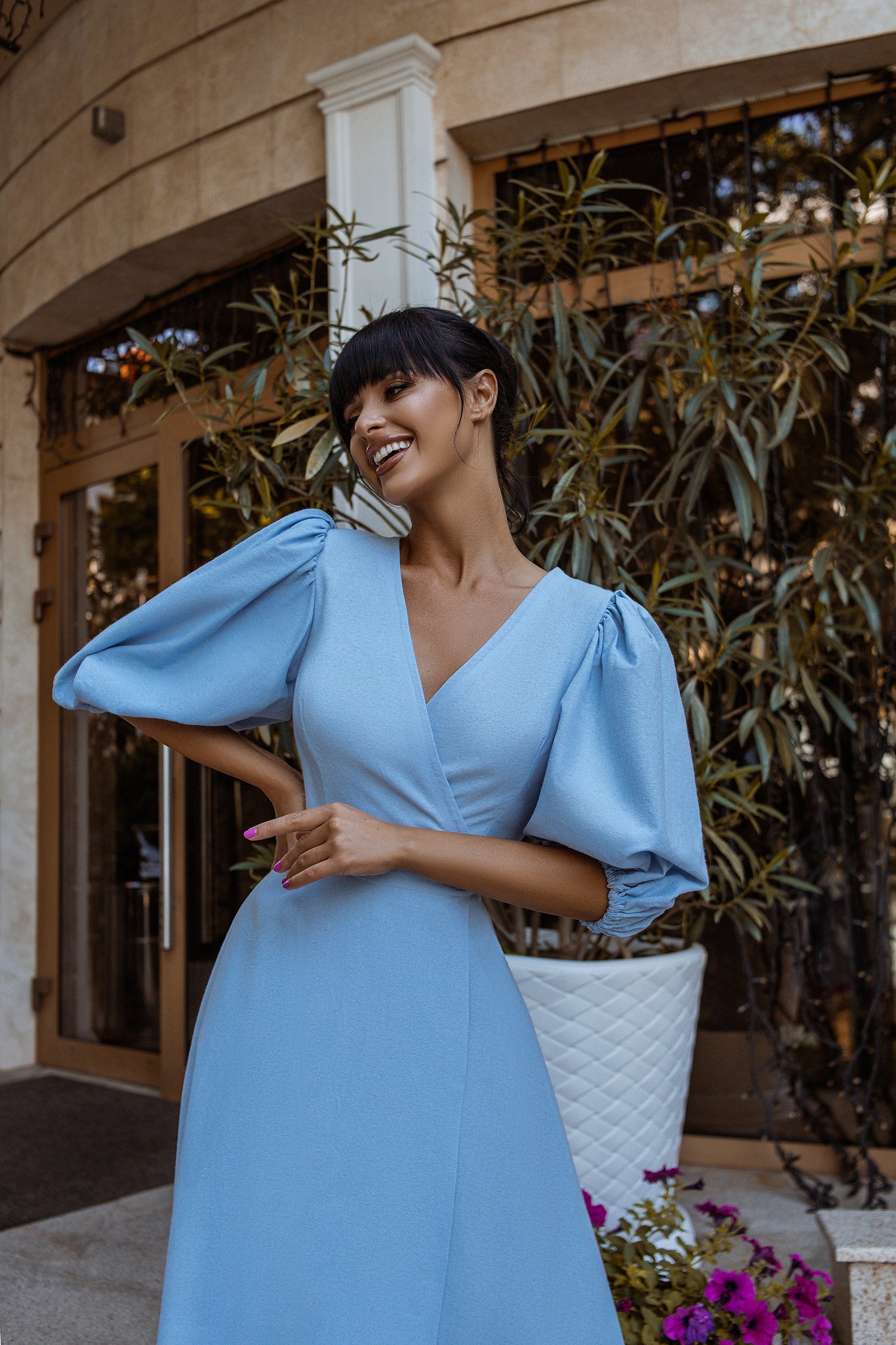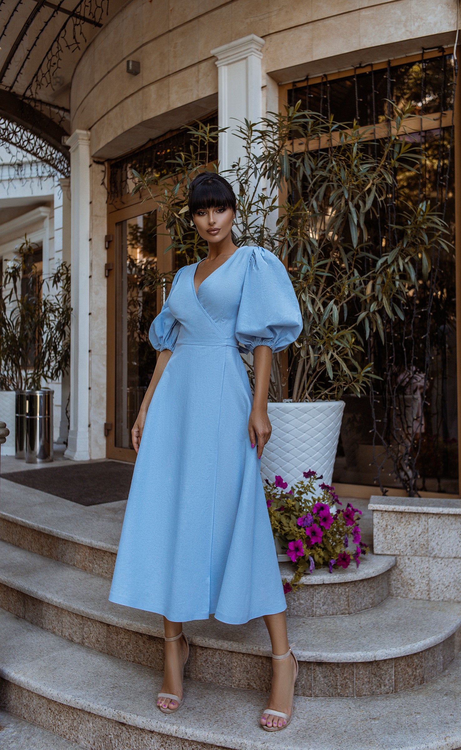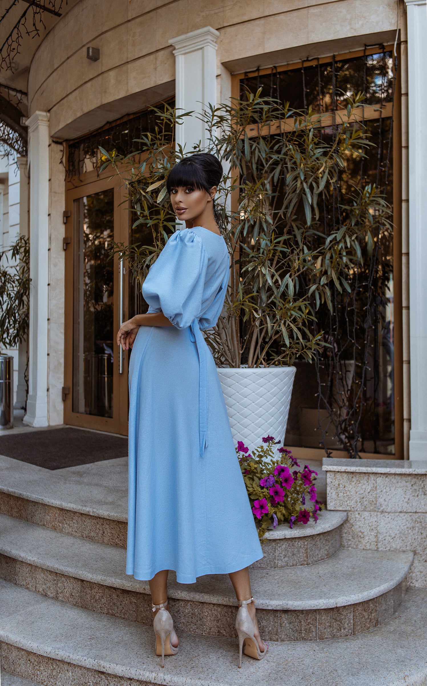 Sky-Blue Puff-Sleeve Wrap Midi Dress