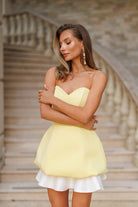 Yellow Sweetheart Strapless White Hem Mini Dress
