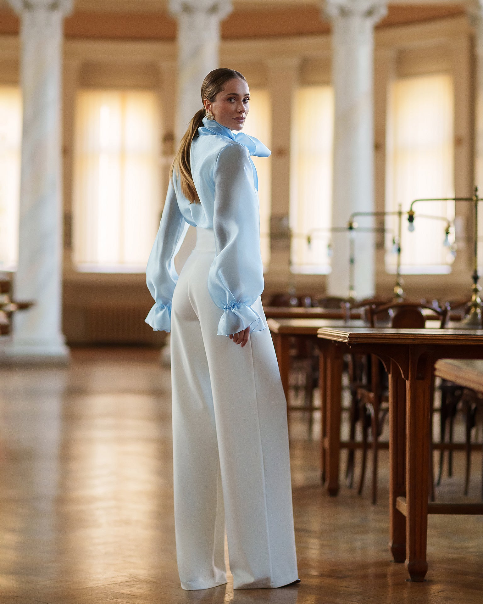 Sky-Blue Sheer Organza Bow-Neck Puff Sleeve Blouse