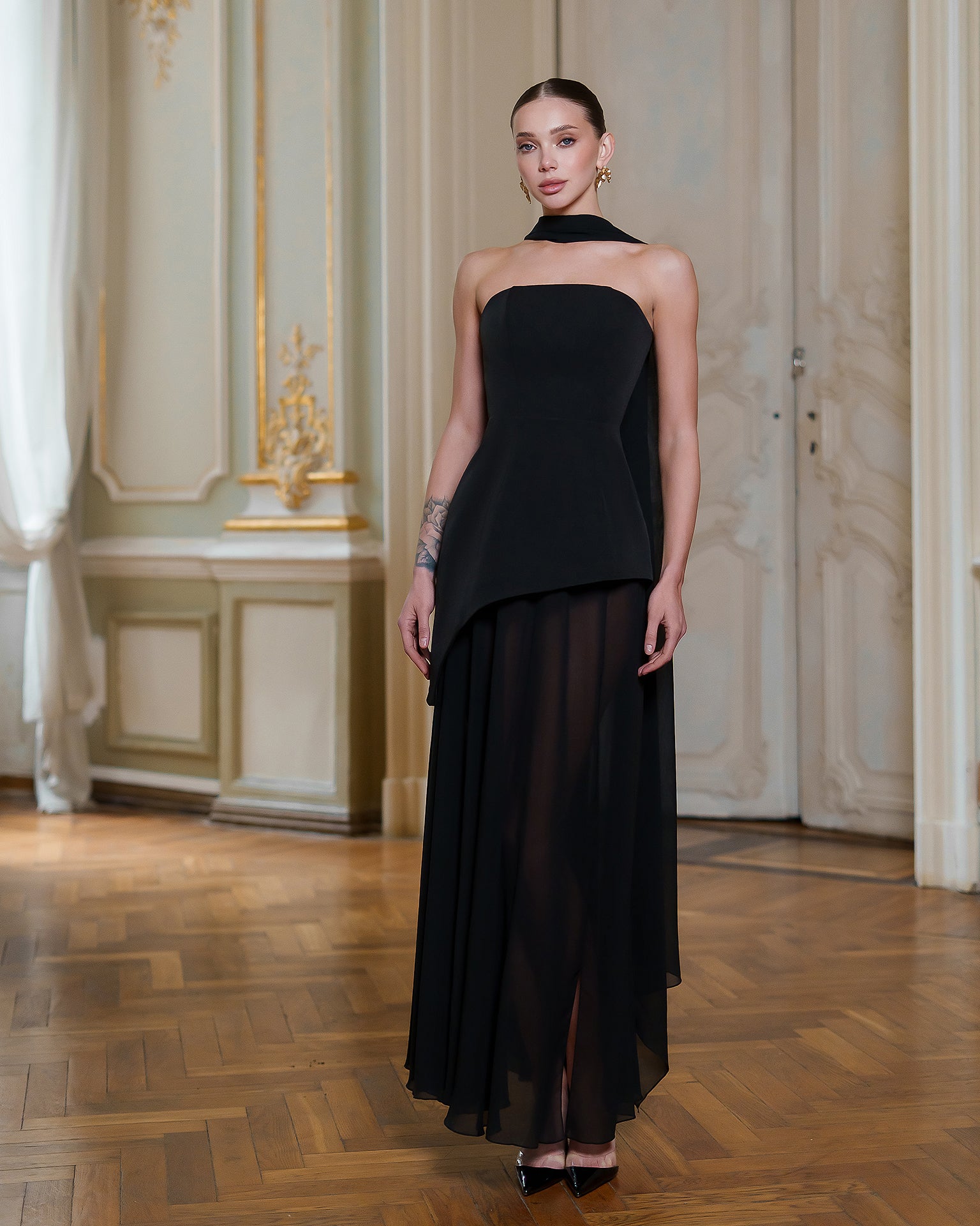Black Strapless Back Scarf Overskirt Maxi Dress