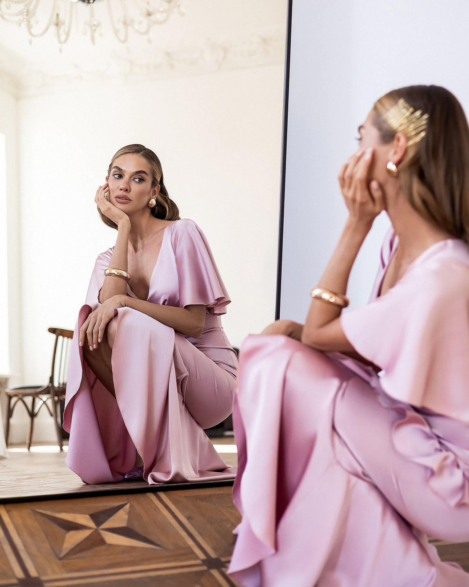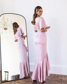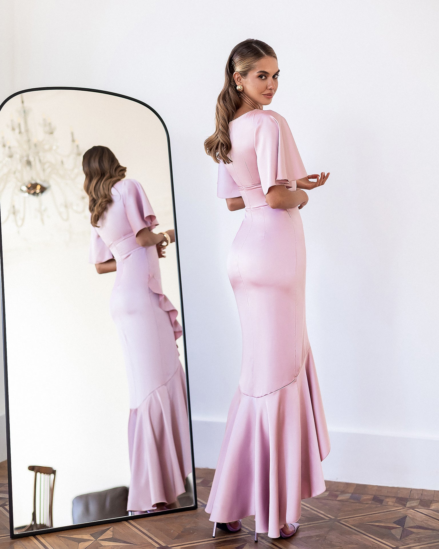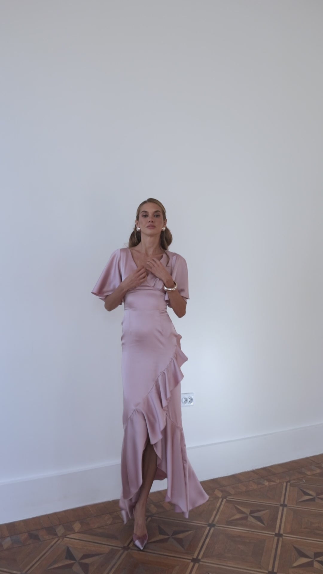 Selina Dusty-Pink Satin V-Neck Asymmetric Ruffle Midi Dress
