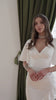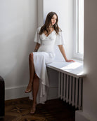 Selina White Satin V-Neck Asymmetric Ruffle Midi Dress