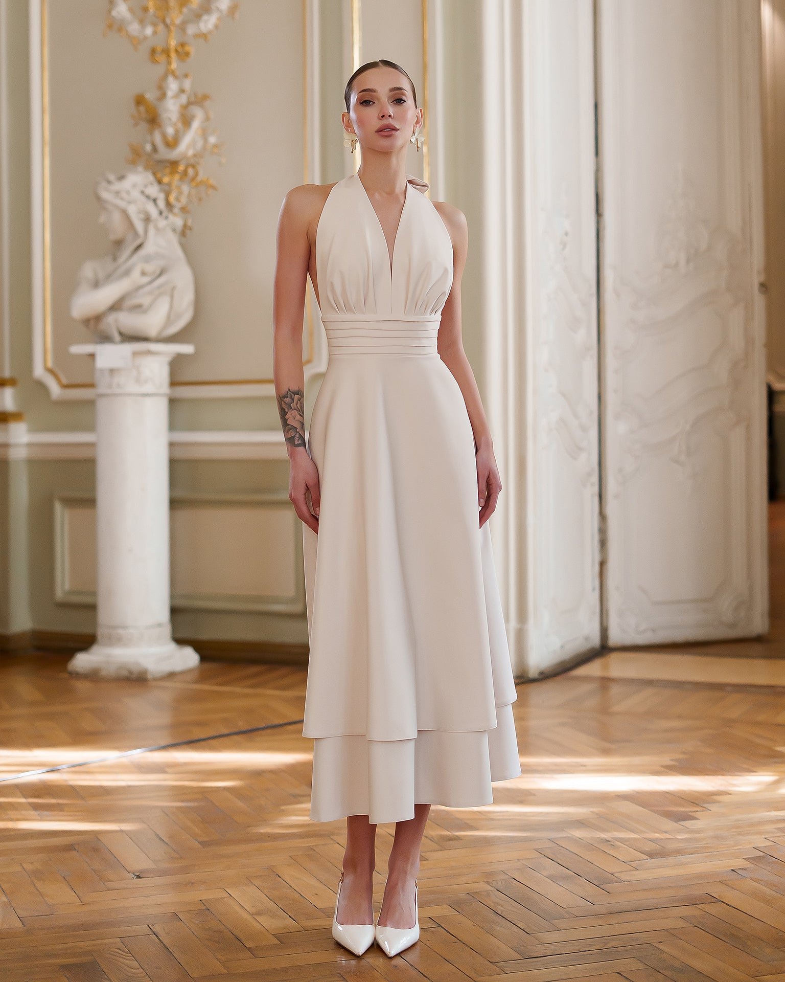 Gloria Beige Open-Back Halter-Neck Midi Dress