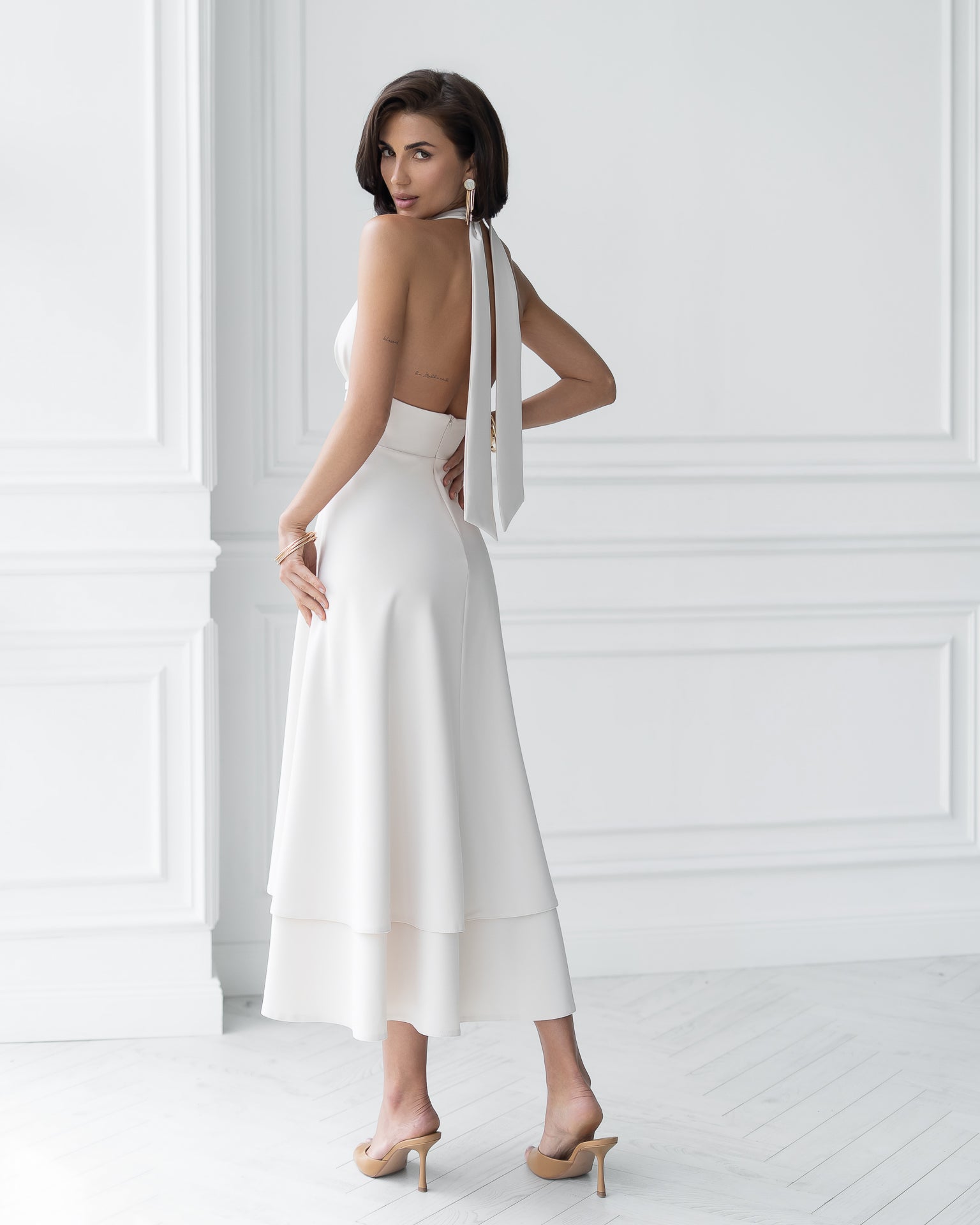 Gloria White Open-Back Halter-Neck Midi Dress