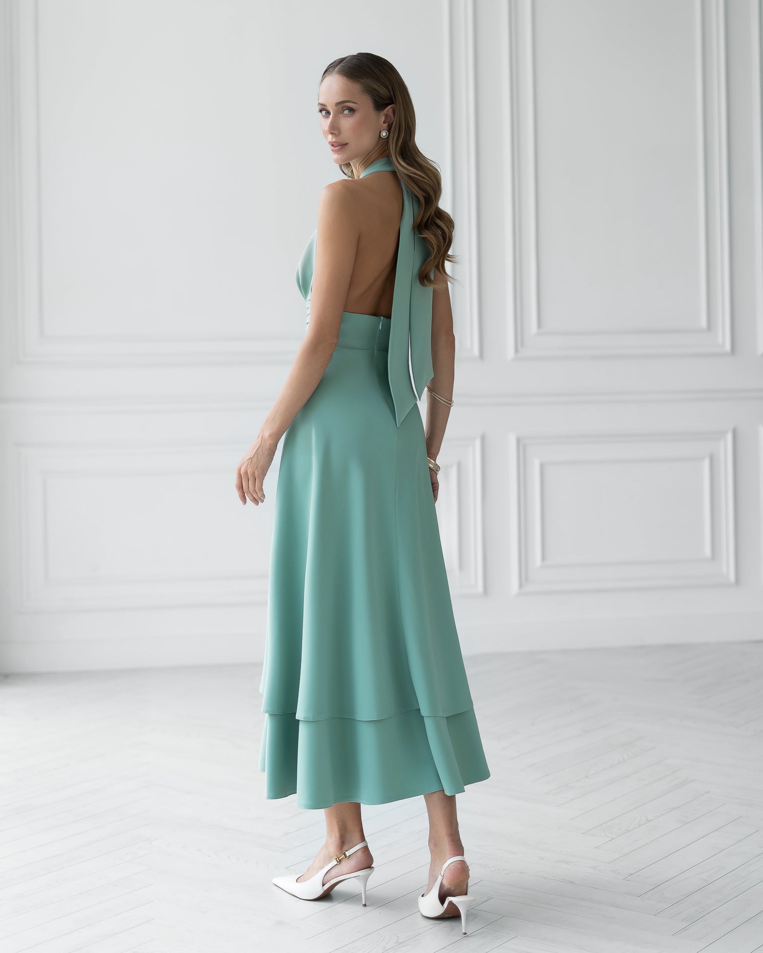Gloria Olive Open-Back Halter-Neck Midi Dress