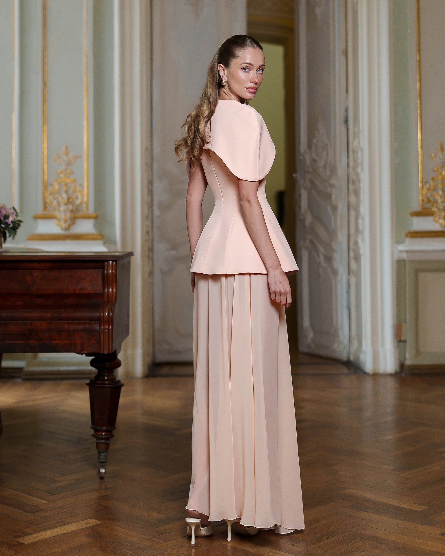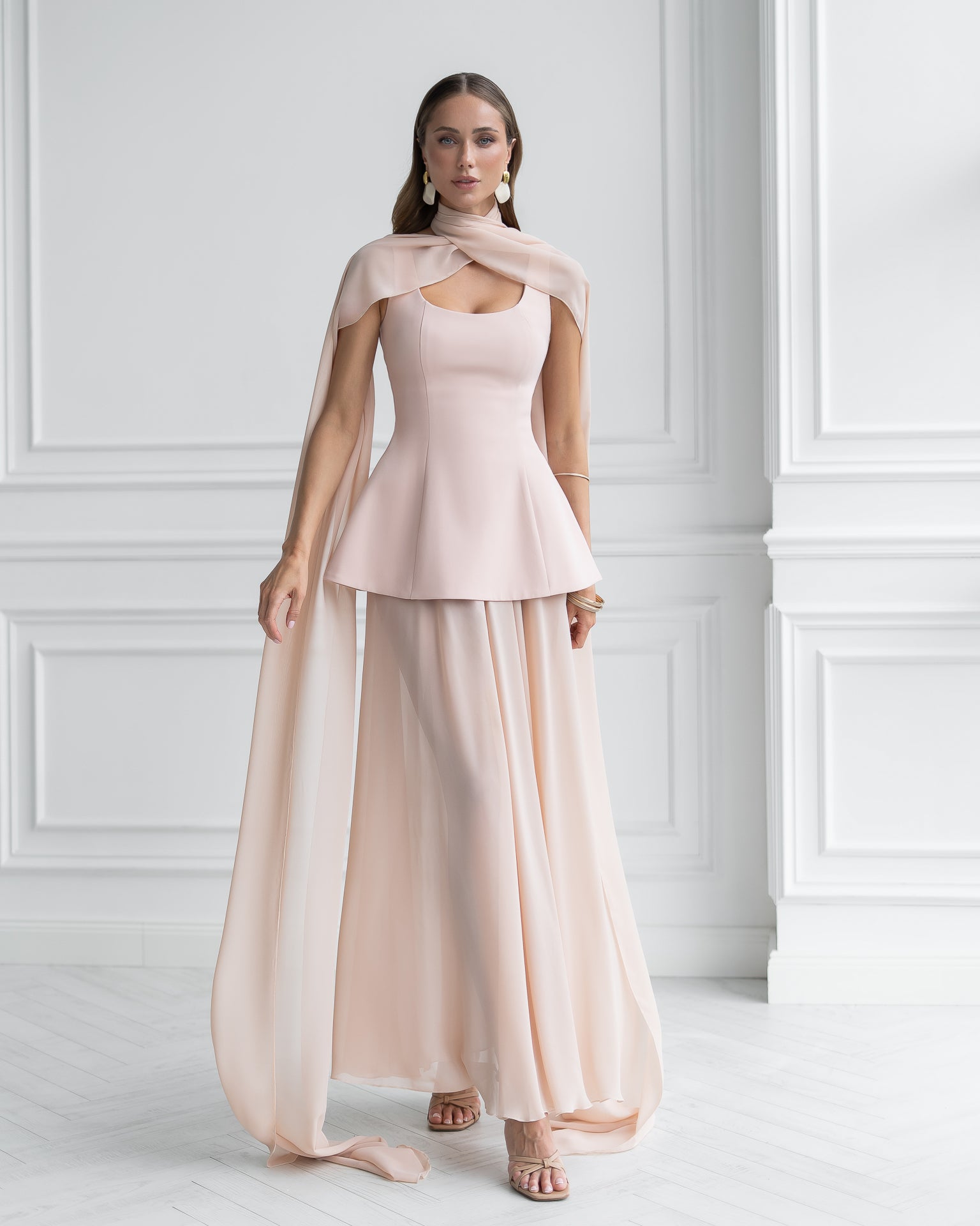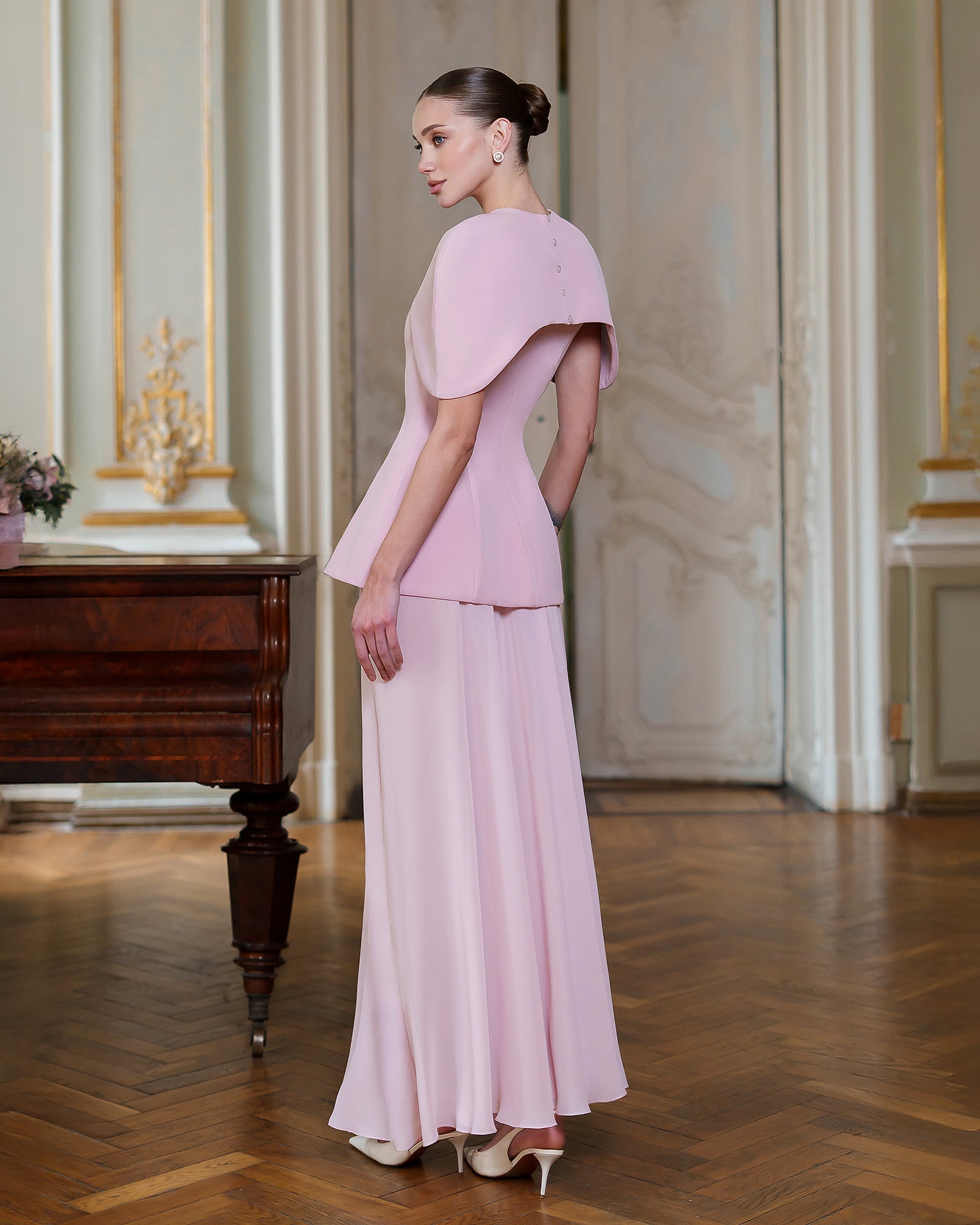 Dusty-Pink Cape-Detail Peplum Chiffon Skirt Maxi Dress