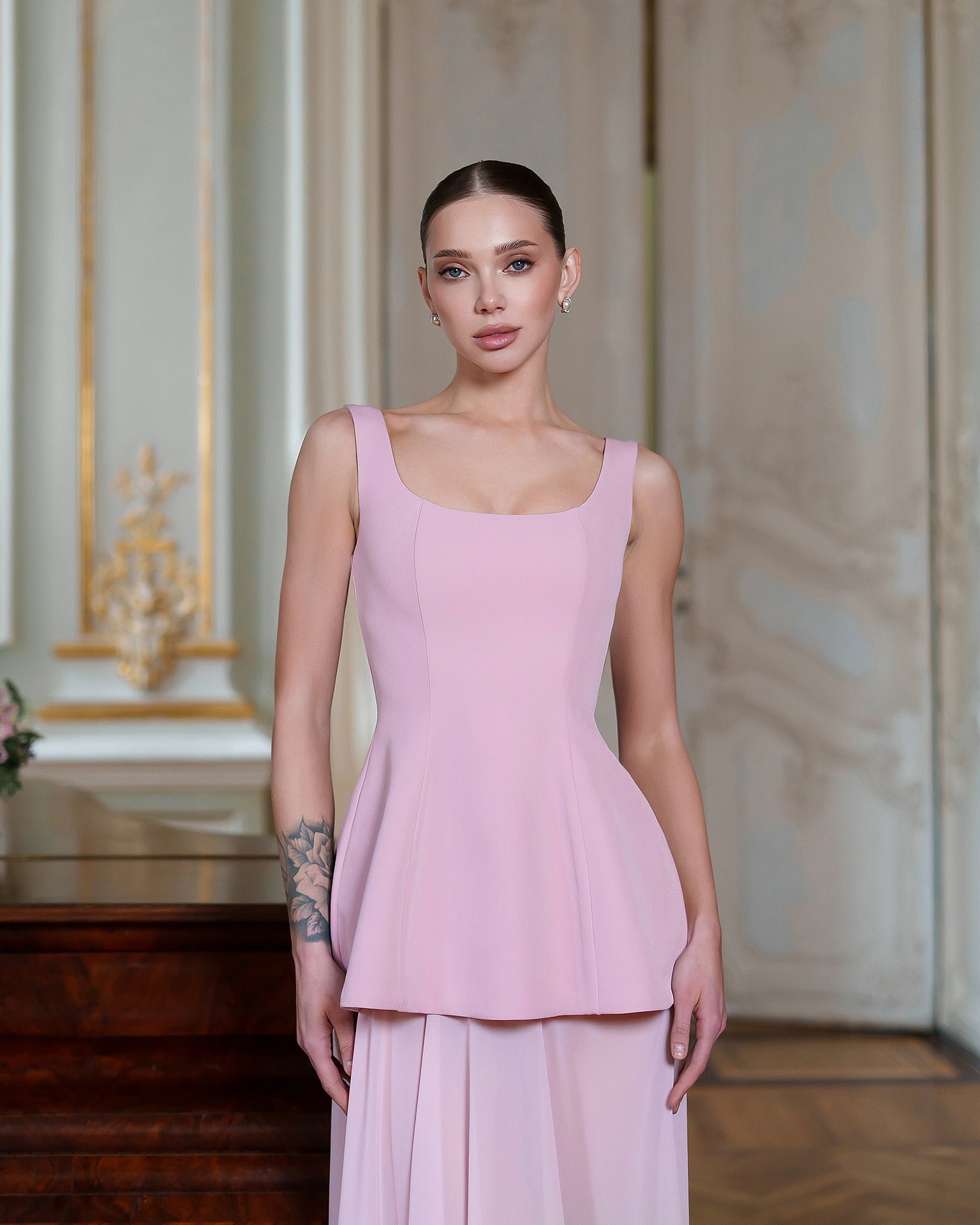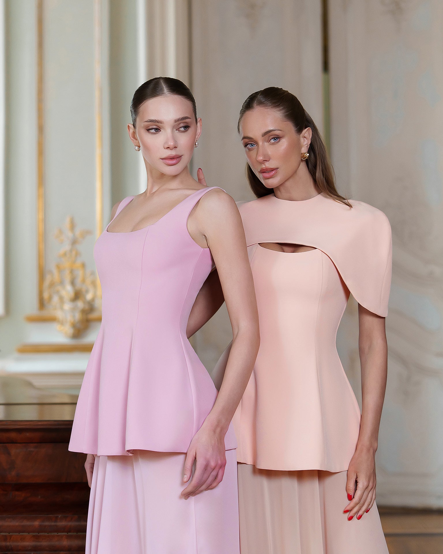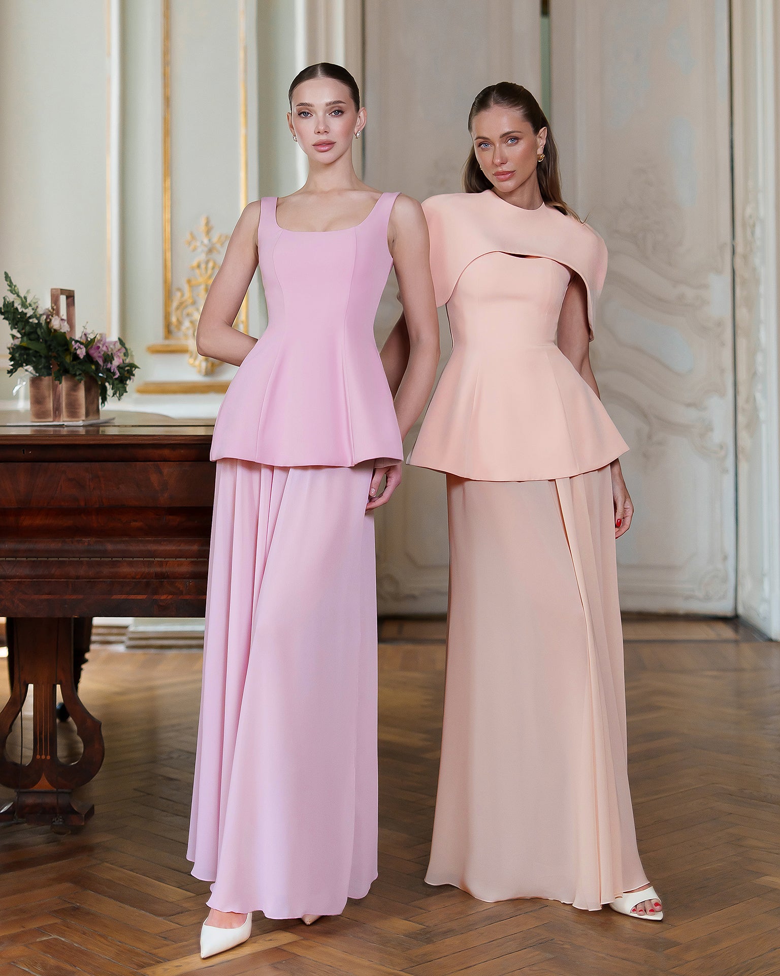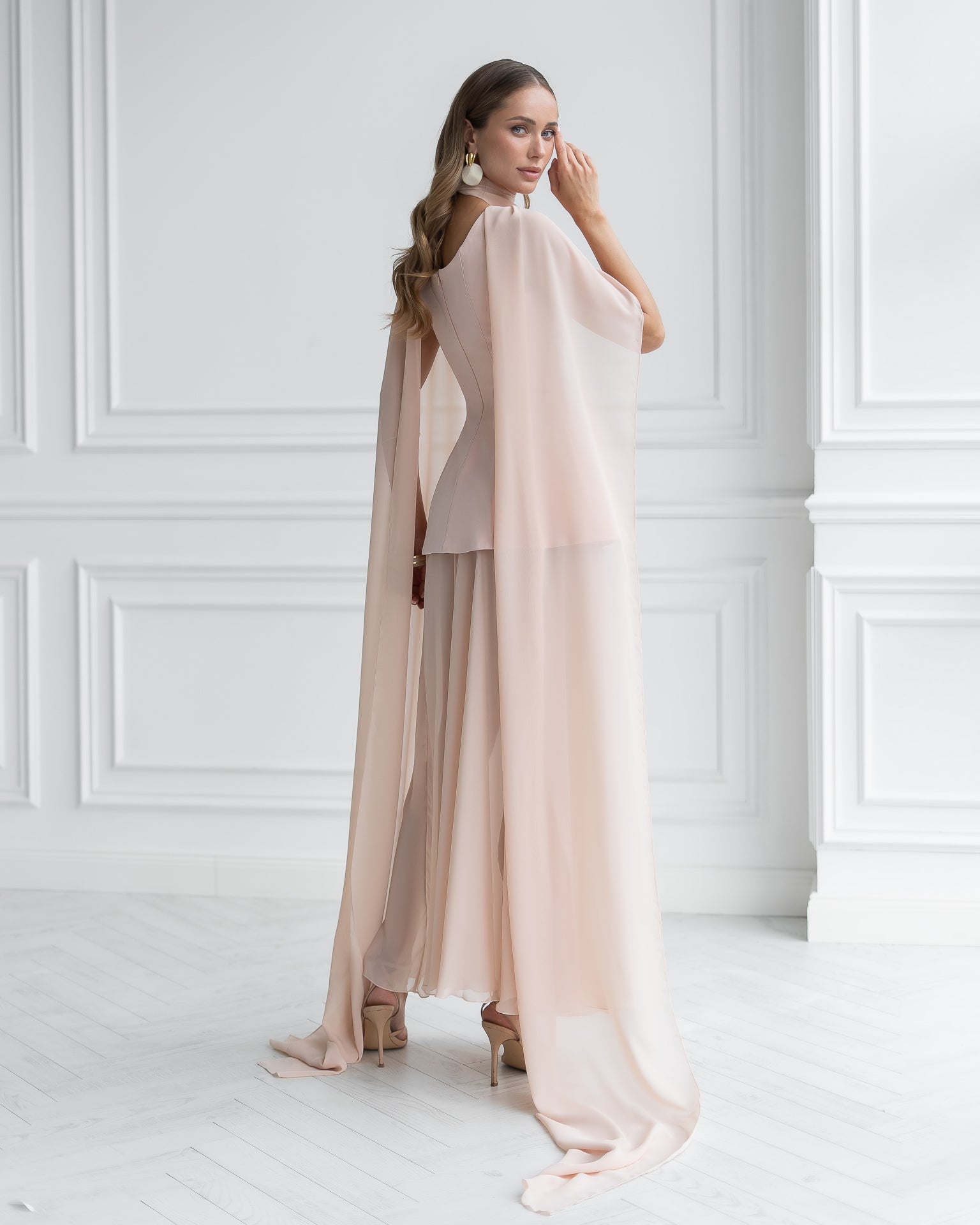 Dusty-Pink Cape-Detail Peplum Chiffon Skirt Maxi Dress