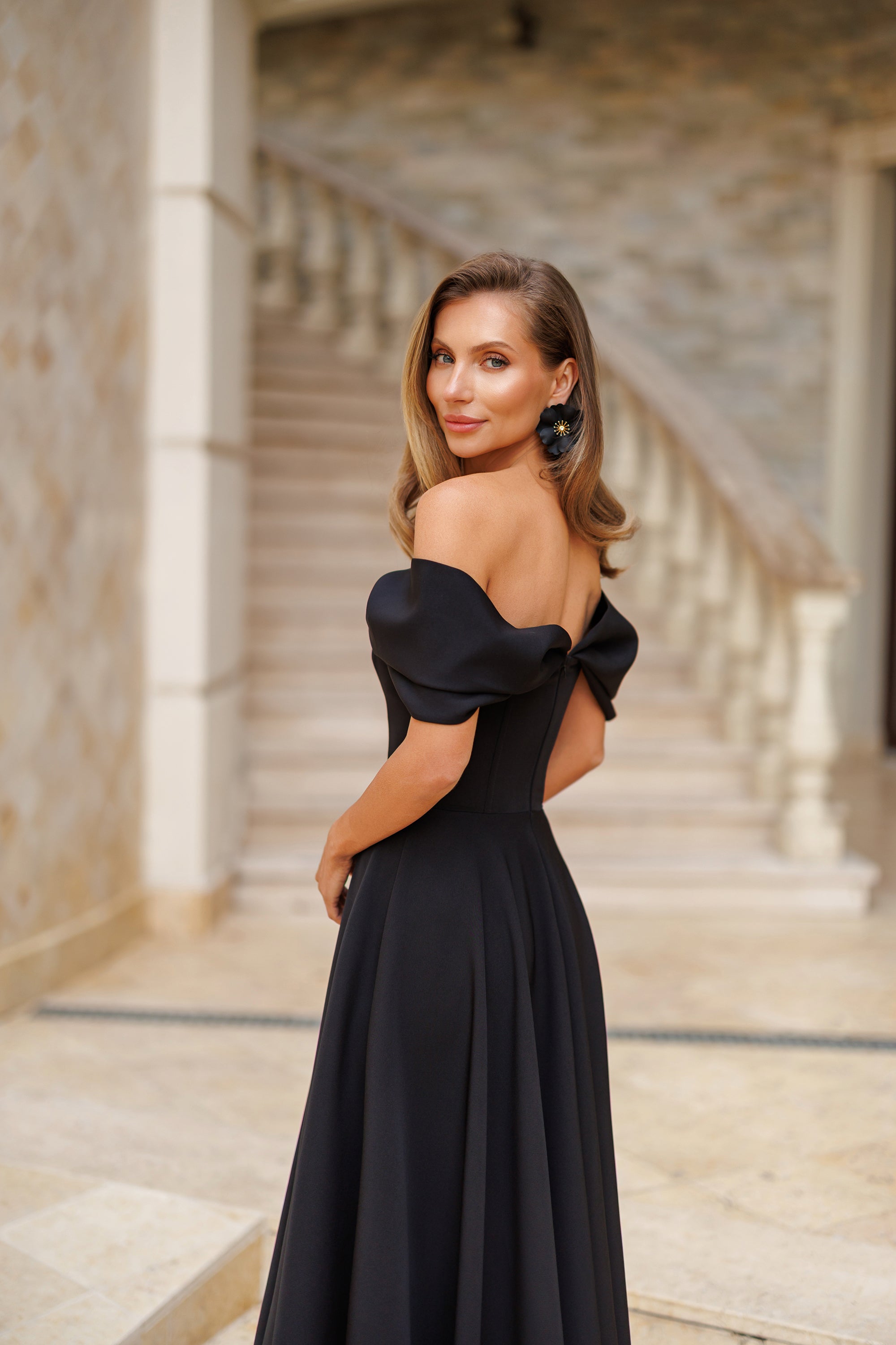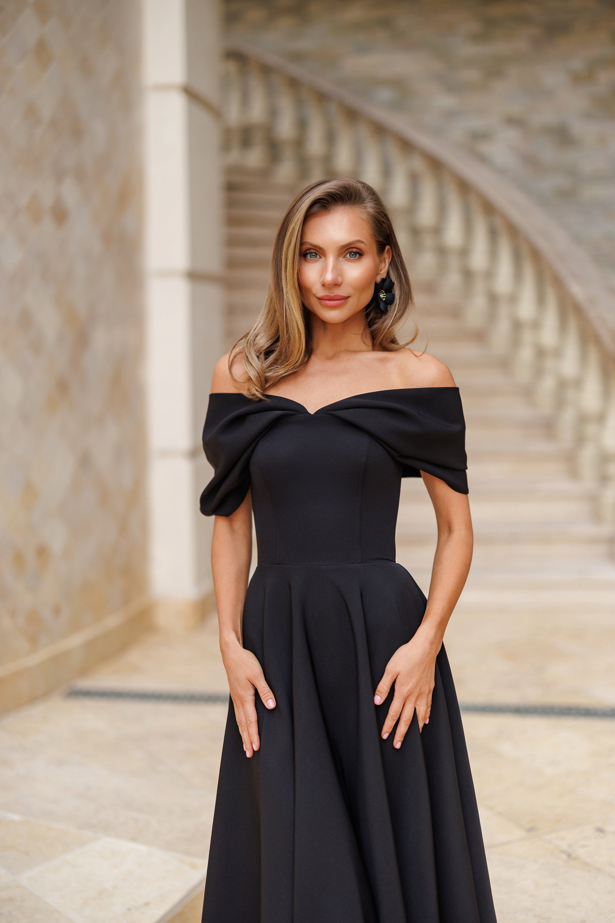 Black Off-The-Shoulder Draped Sleeve Midi Dress