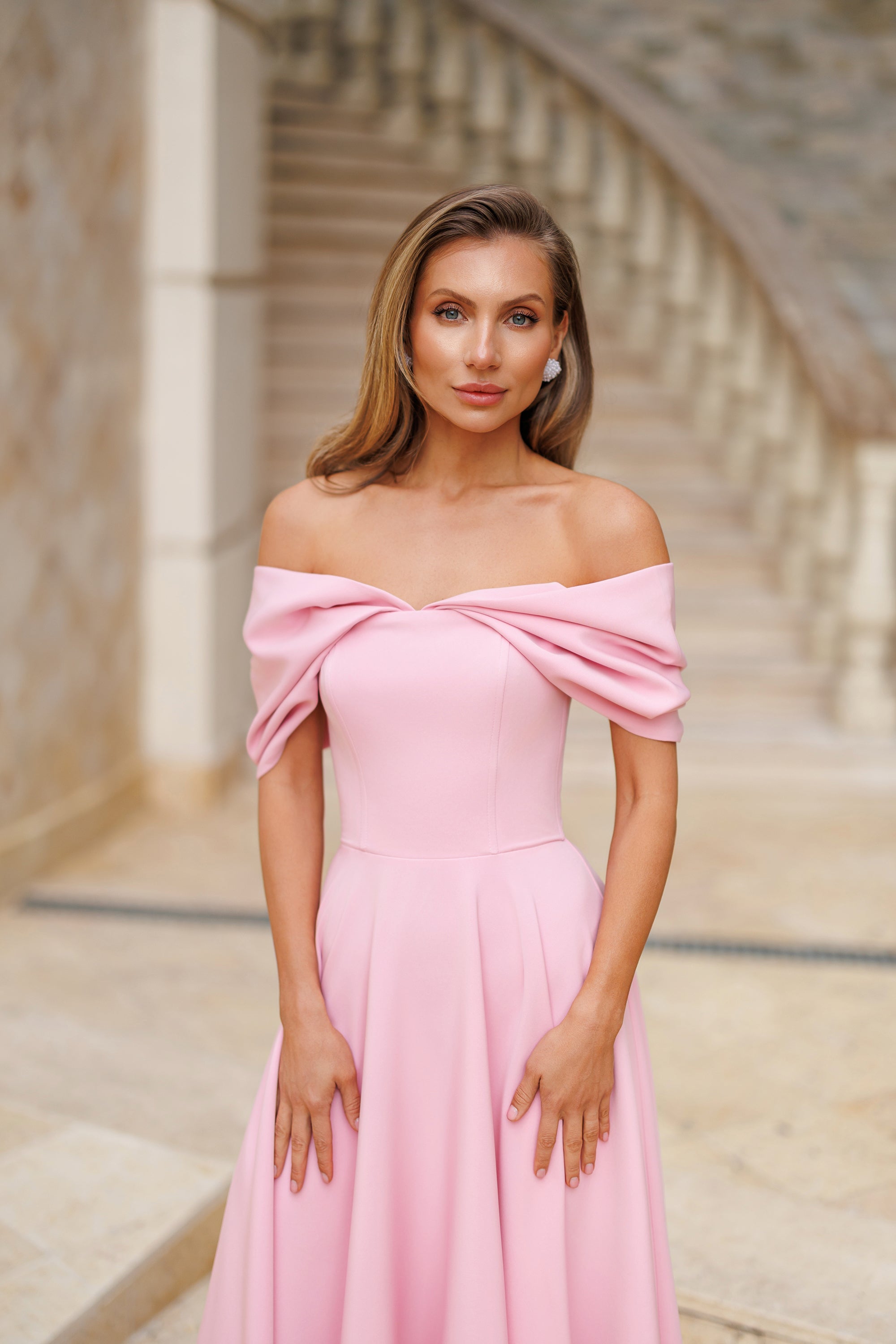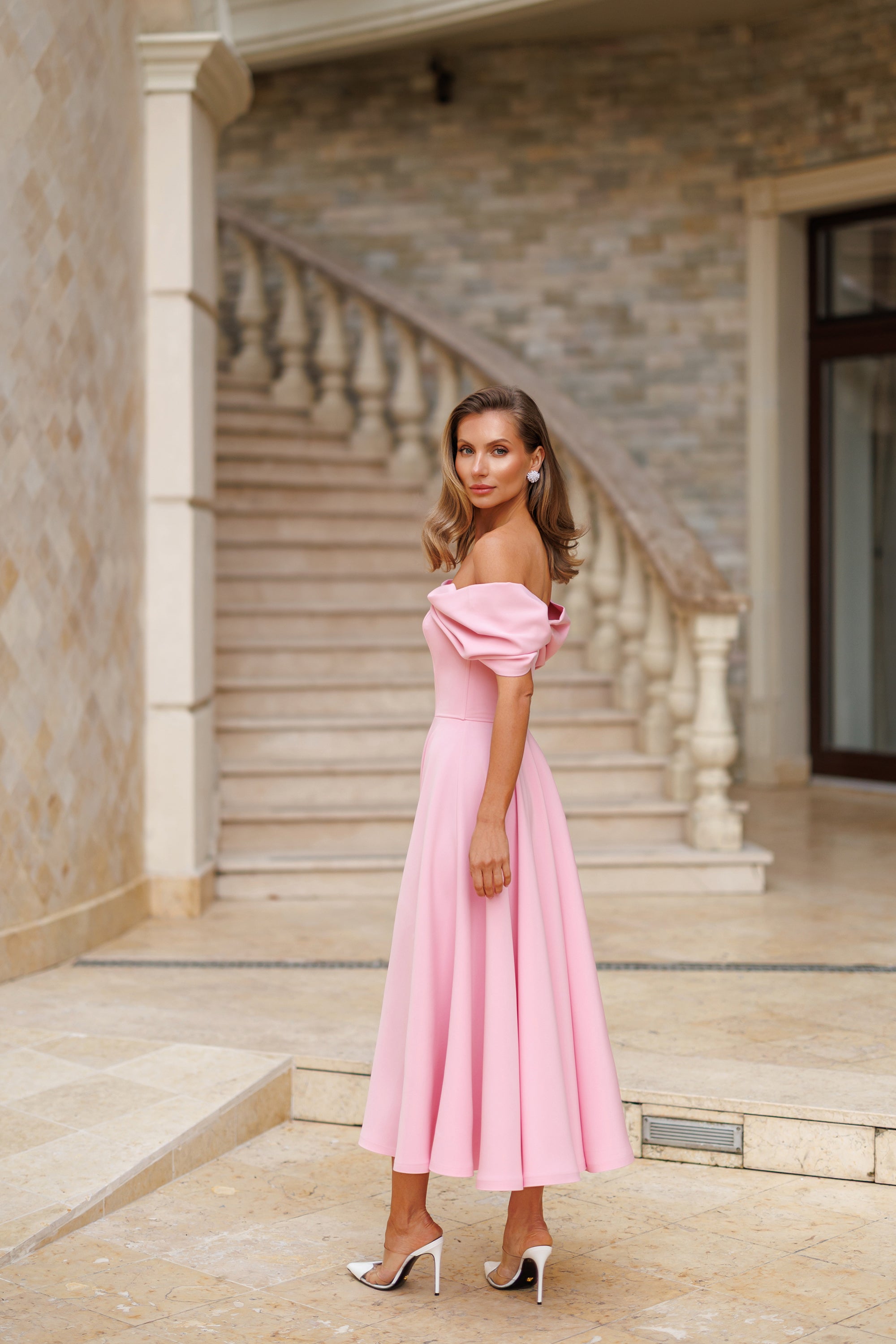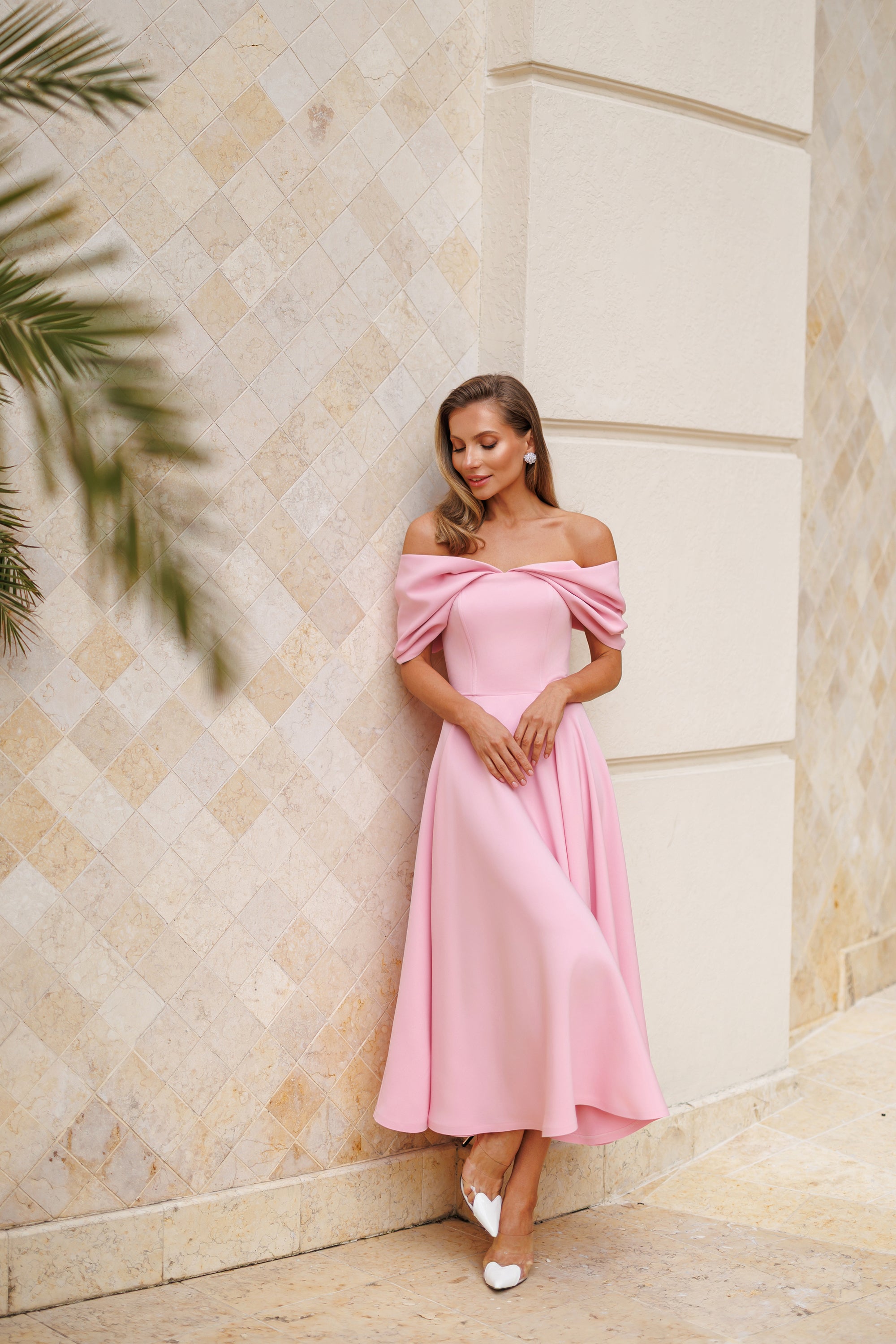Pink Off-The-Shoulder Draped Sleeve Midi Dress