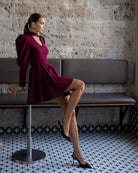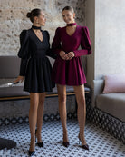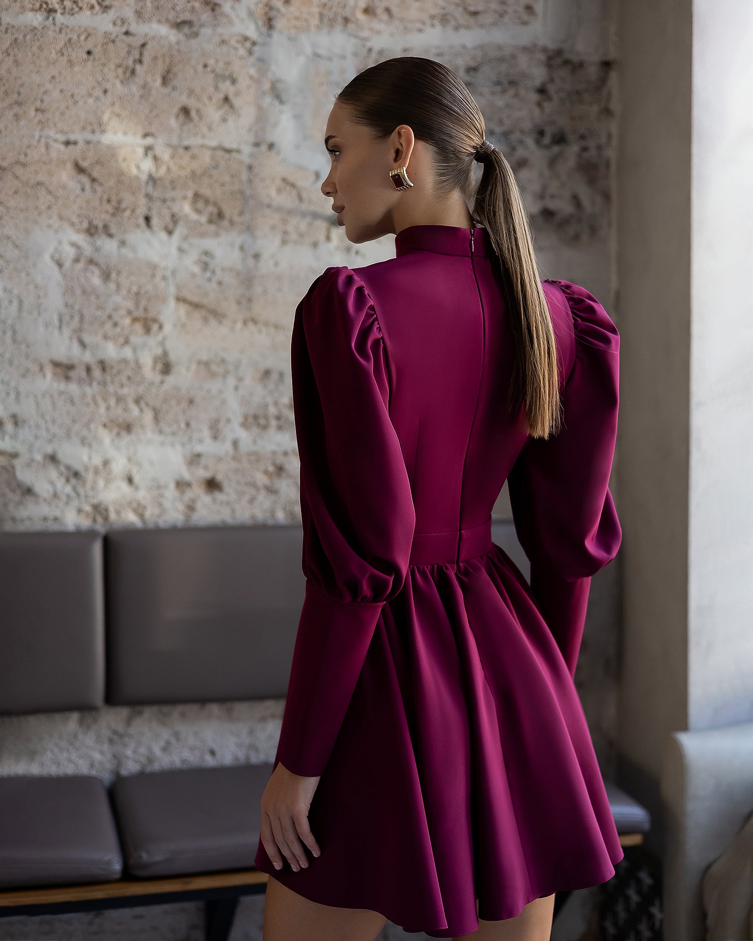 Bella Bordeaux Choker-Neck Puff Sleeve Mini Dress